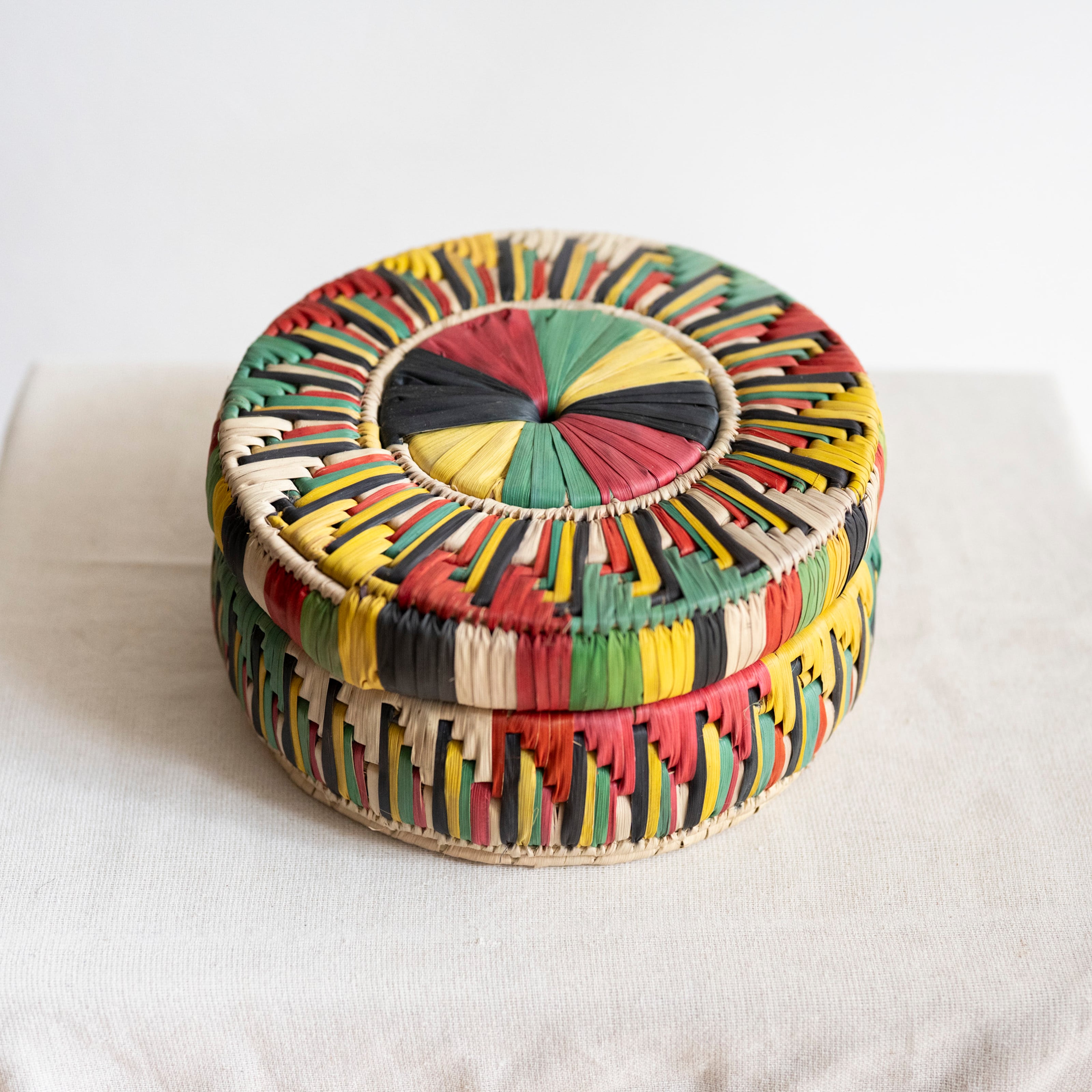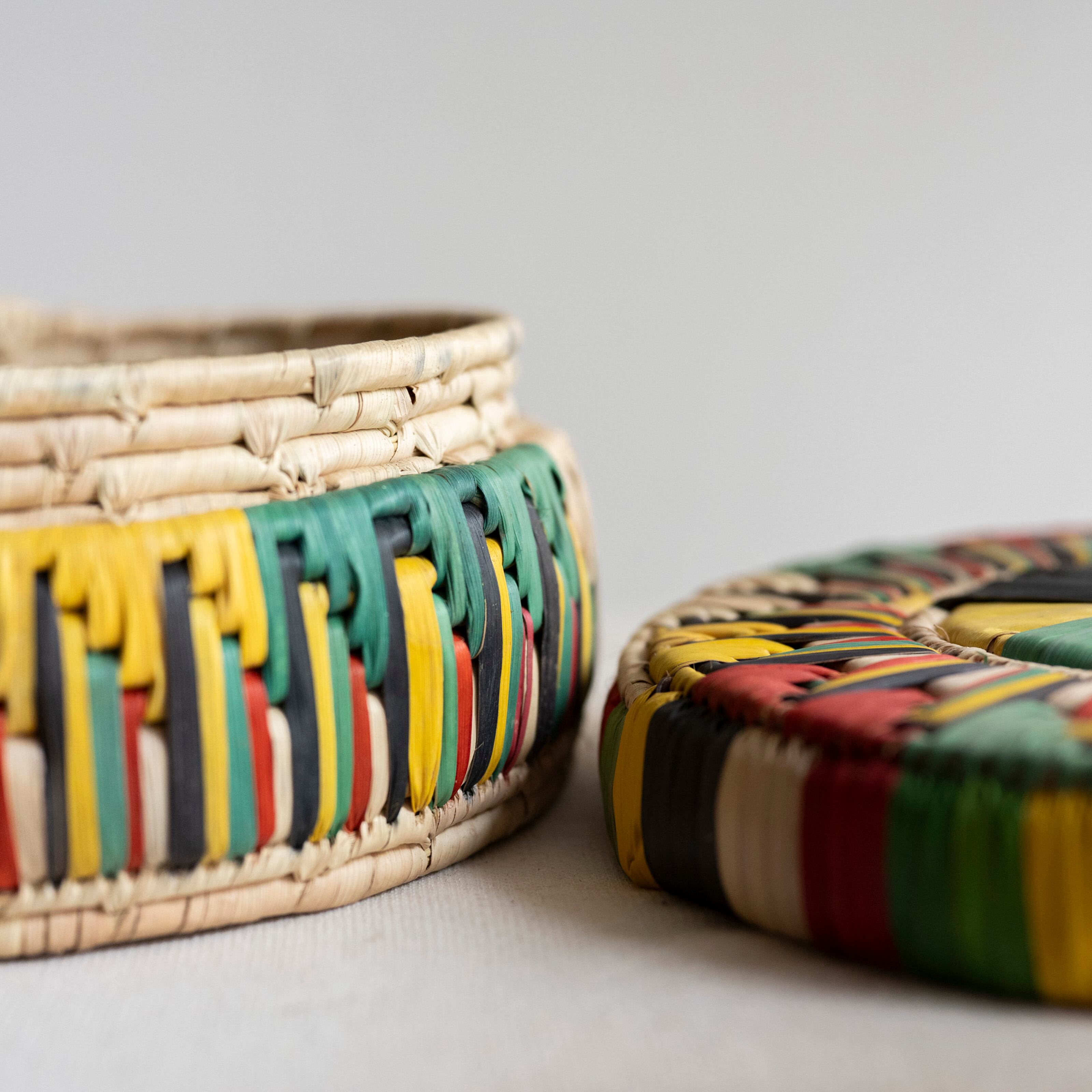 カラフルなパキスタンのかごシリーズの、フタ付きのデザインです。