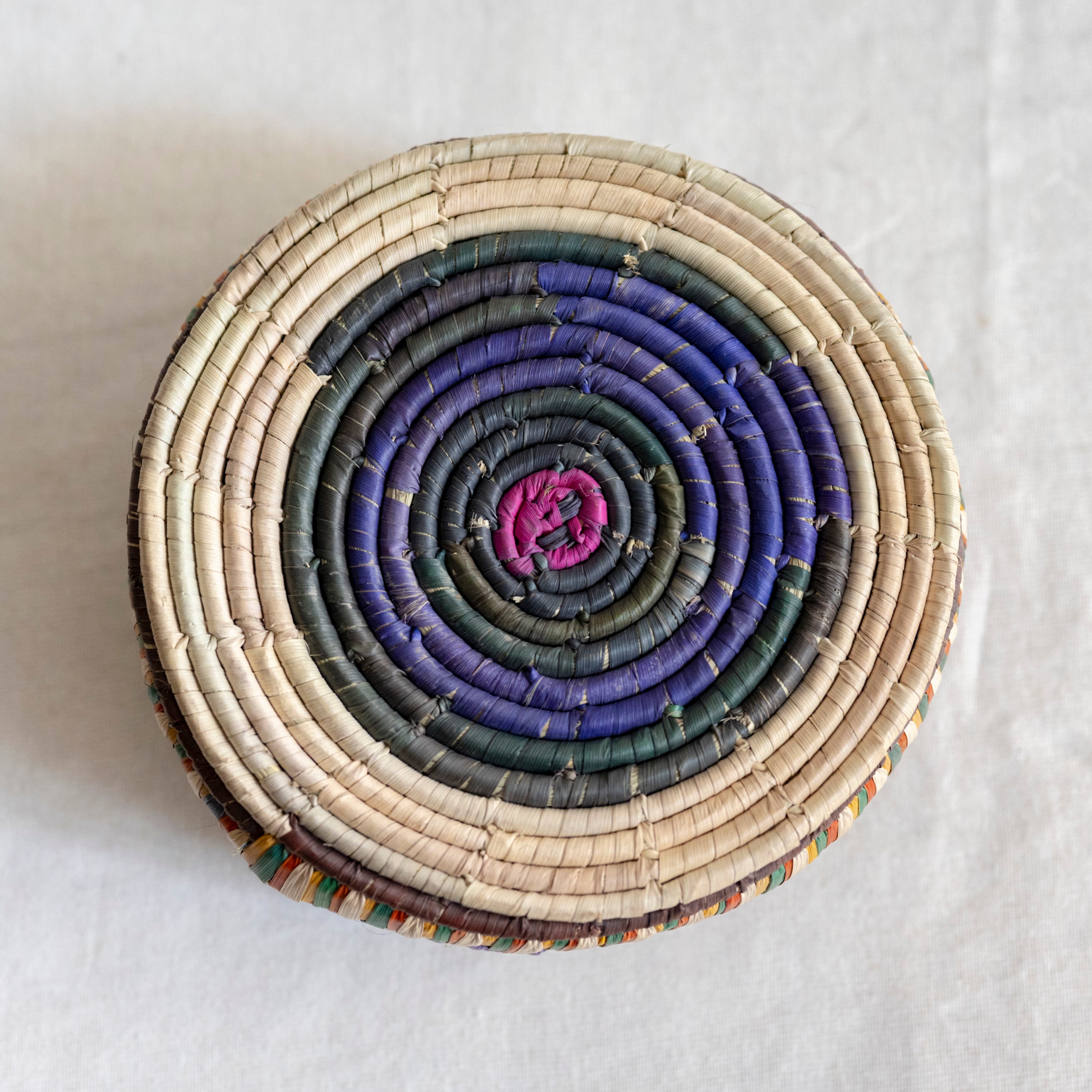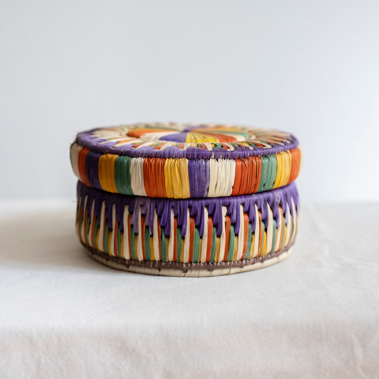 カラフルなパキスタンのかごシリーズの、フタ付きのデザインです。