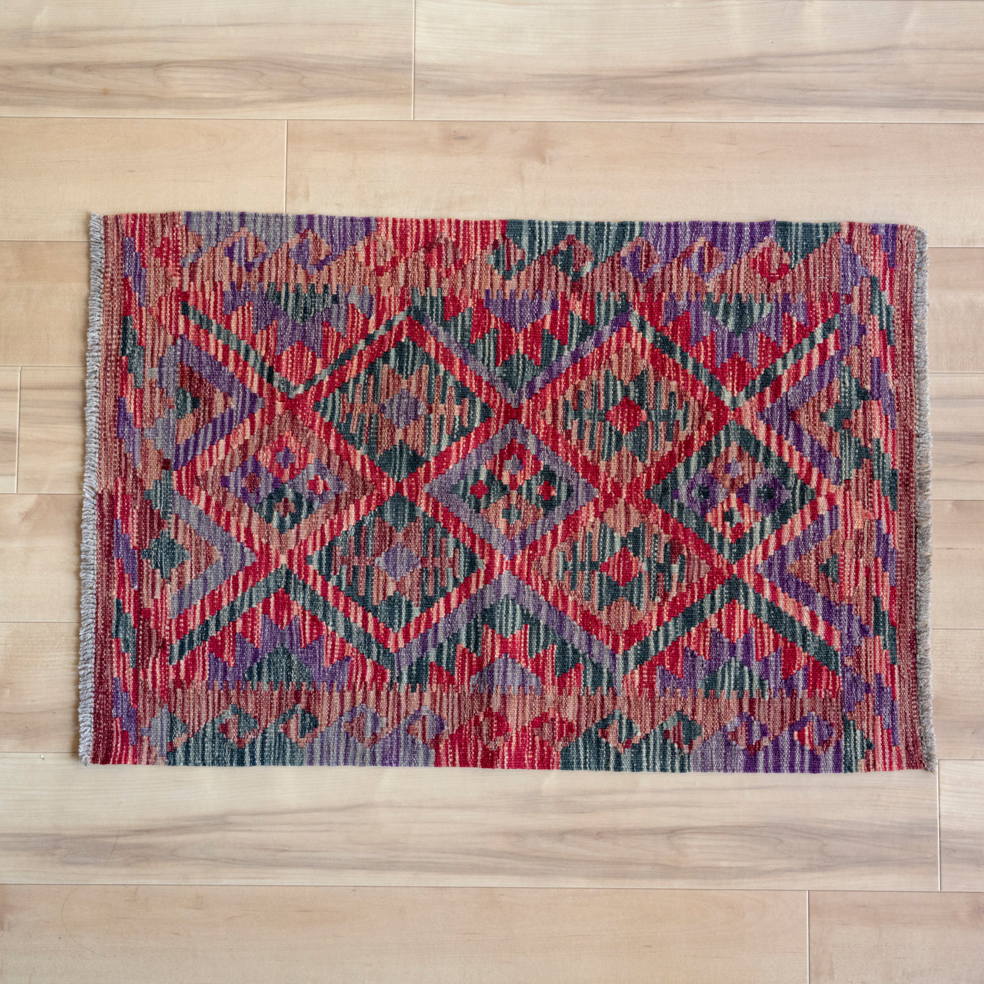 アフガニスタンで手織りでつくられた、カラフルなキリムラグ。