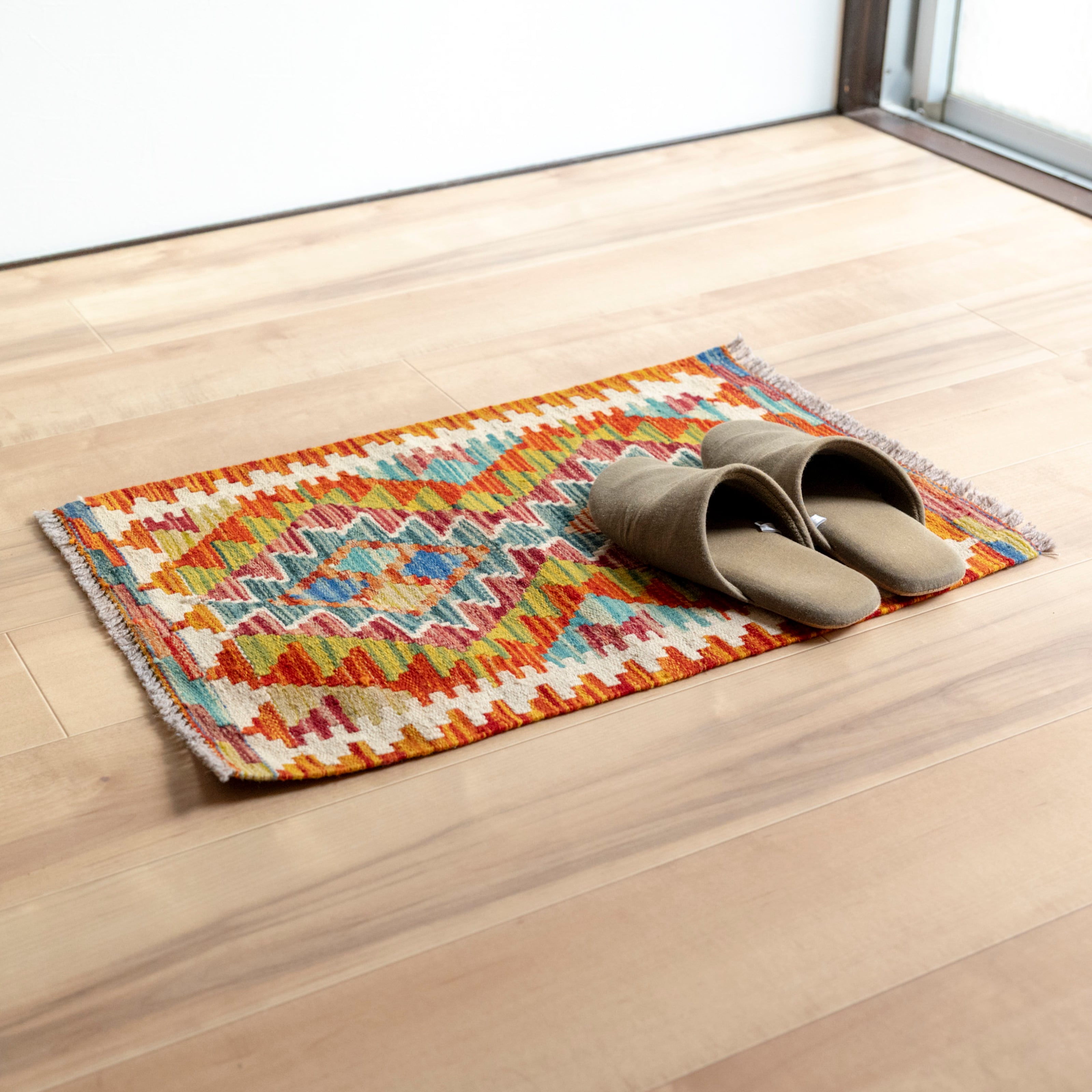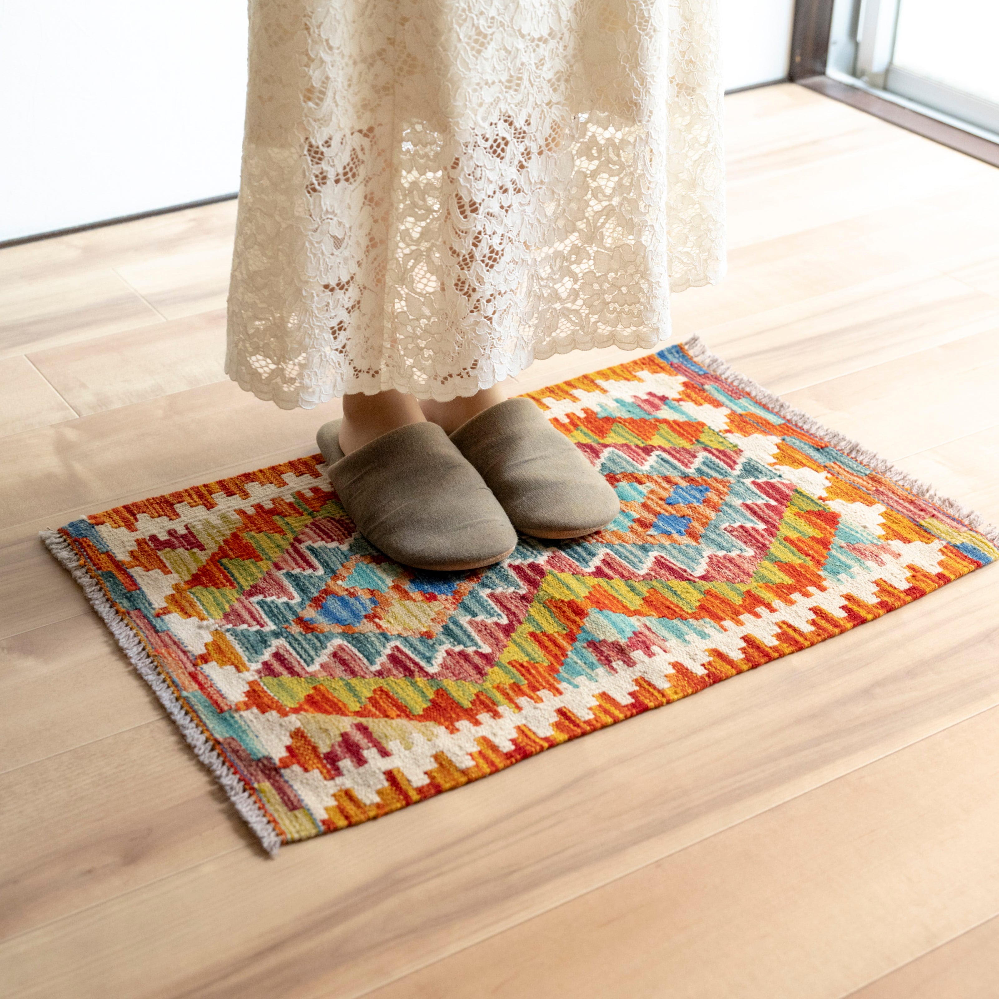 MONDAYのお店で玄関マットとして使っているキリムラグは、