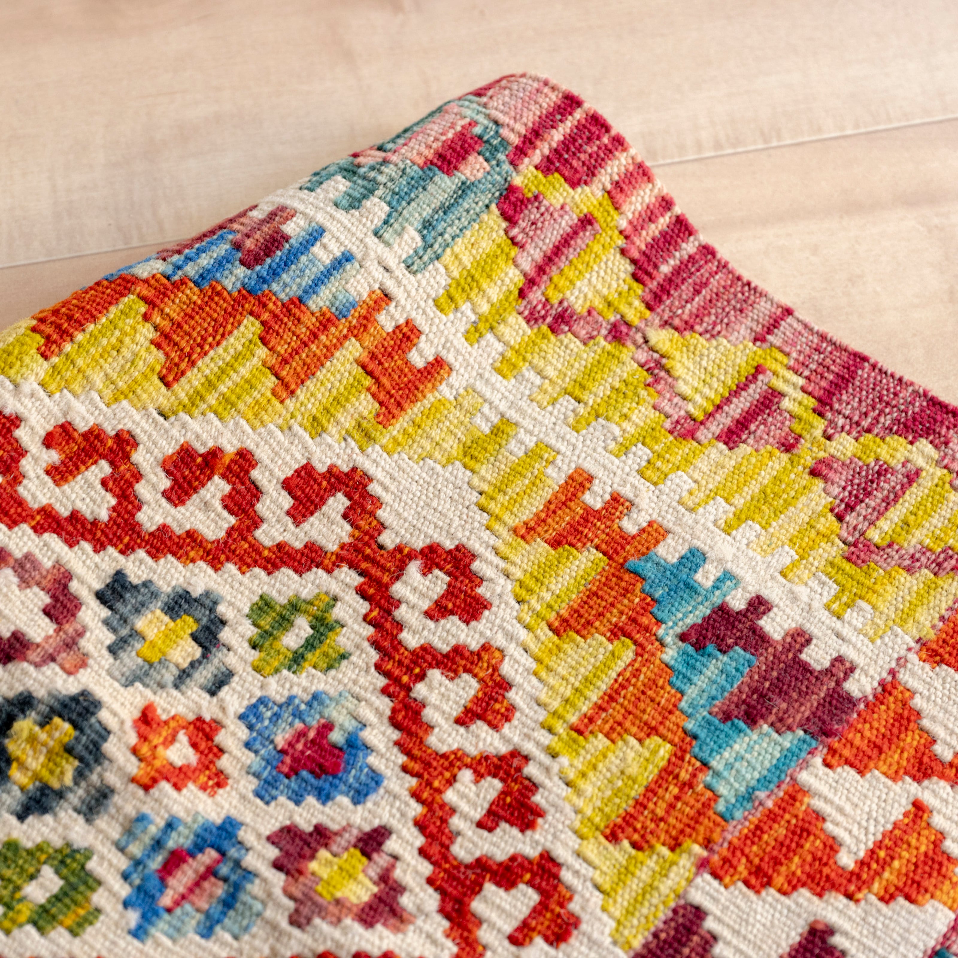 初めて素足でキリムに足をのせると、ちょっとゴワゴワした印象があるかもしれません。
