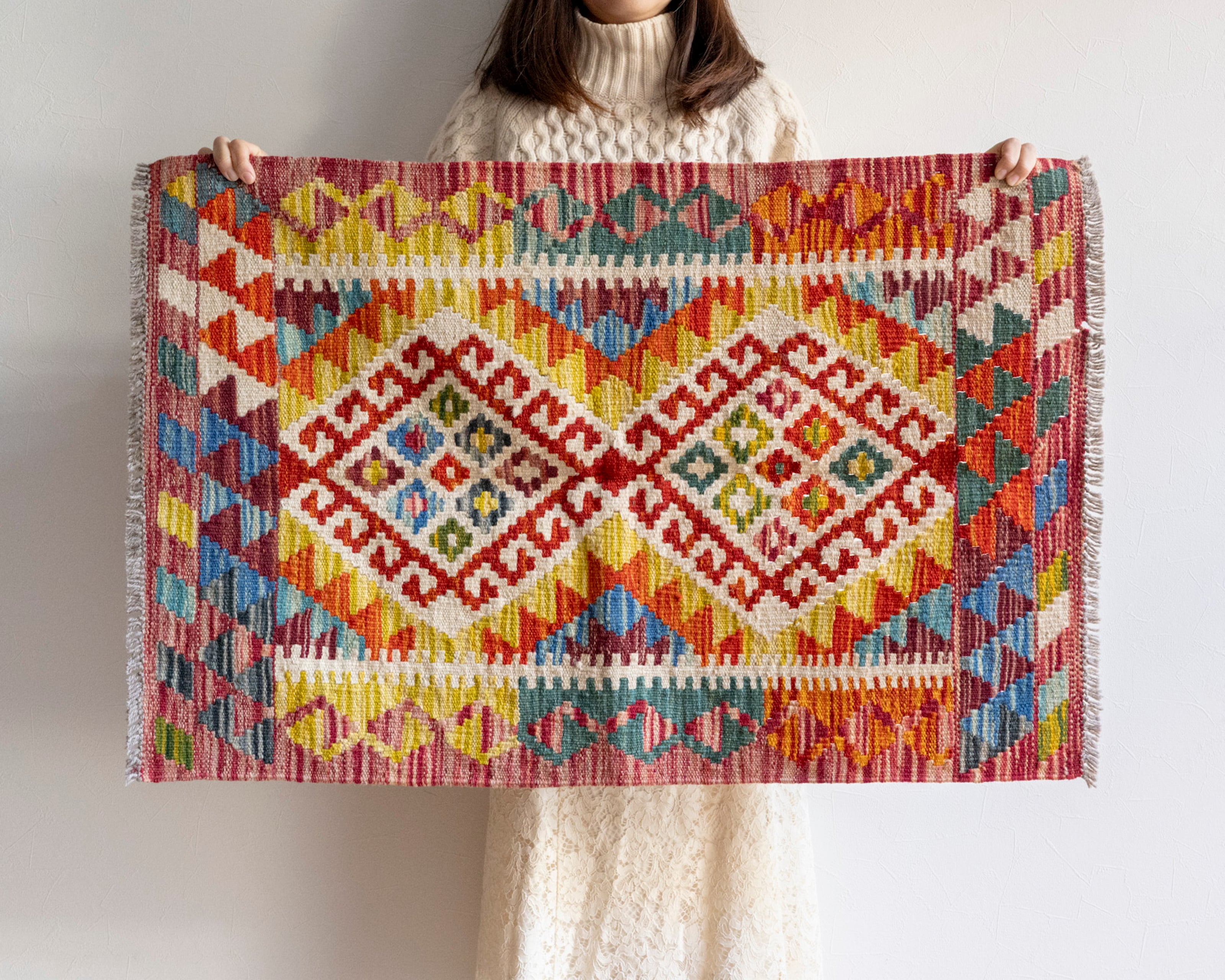 カラフルなキリムは、鮮やかに染めたウールで織る幾何学模様が特徴的ですが、