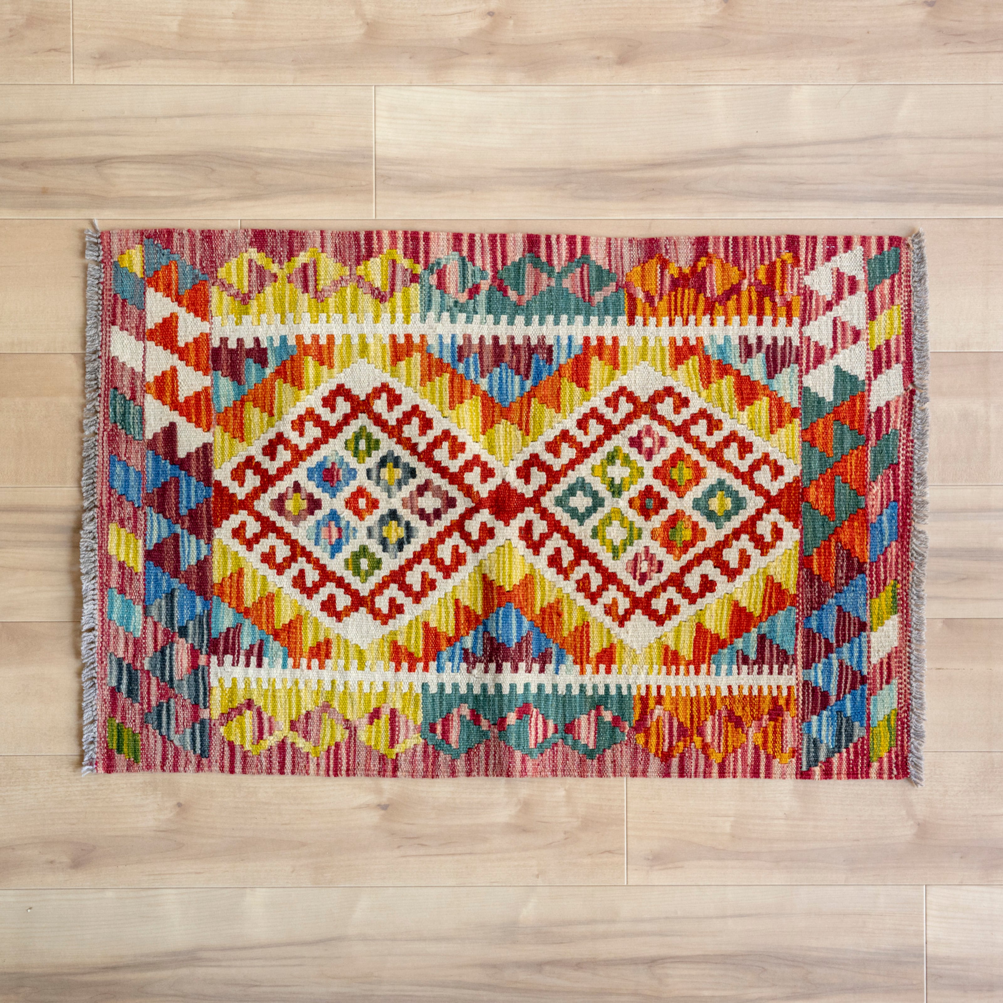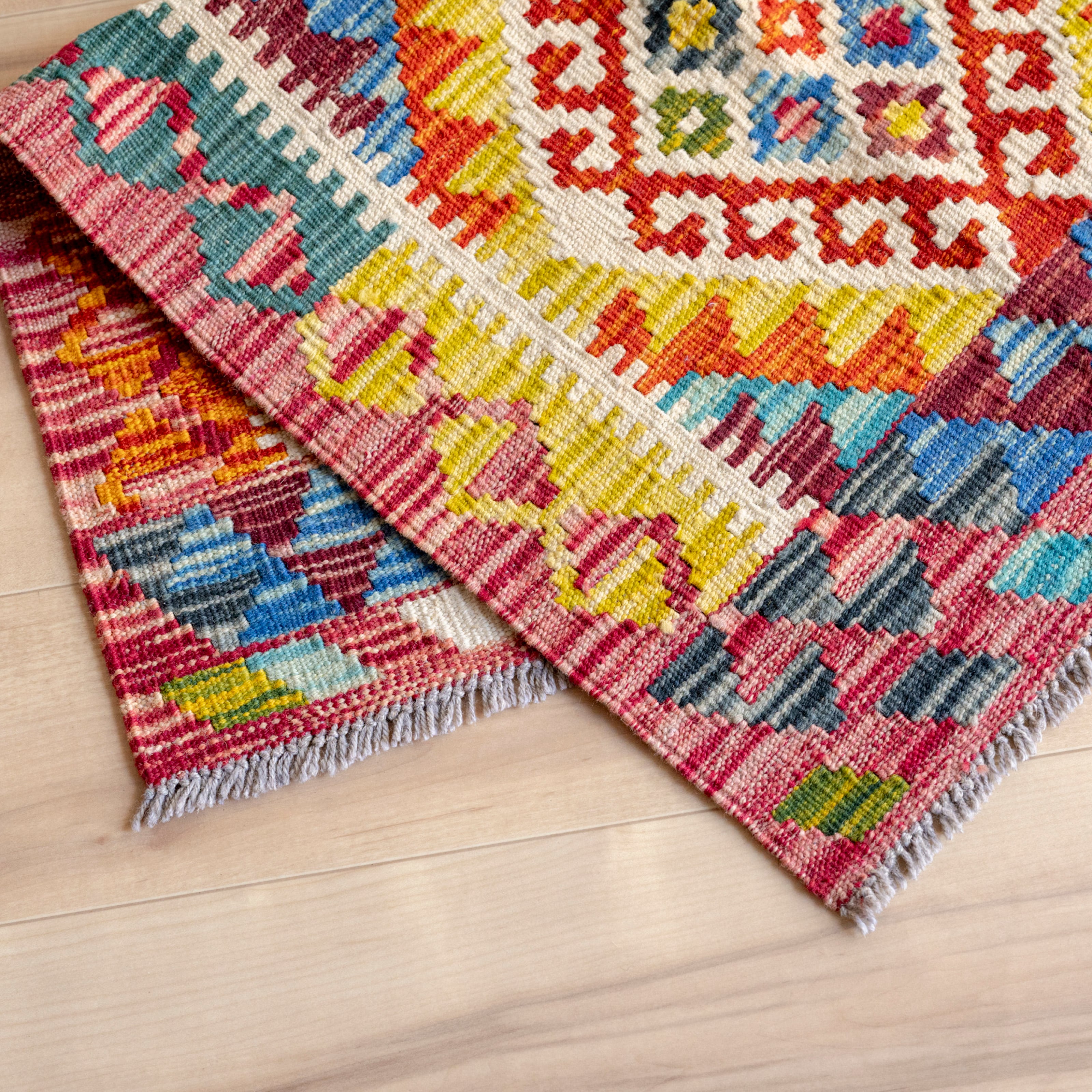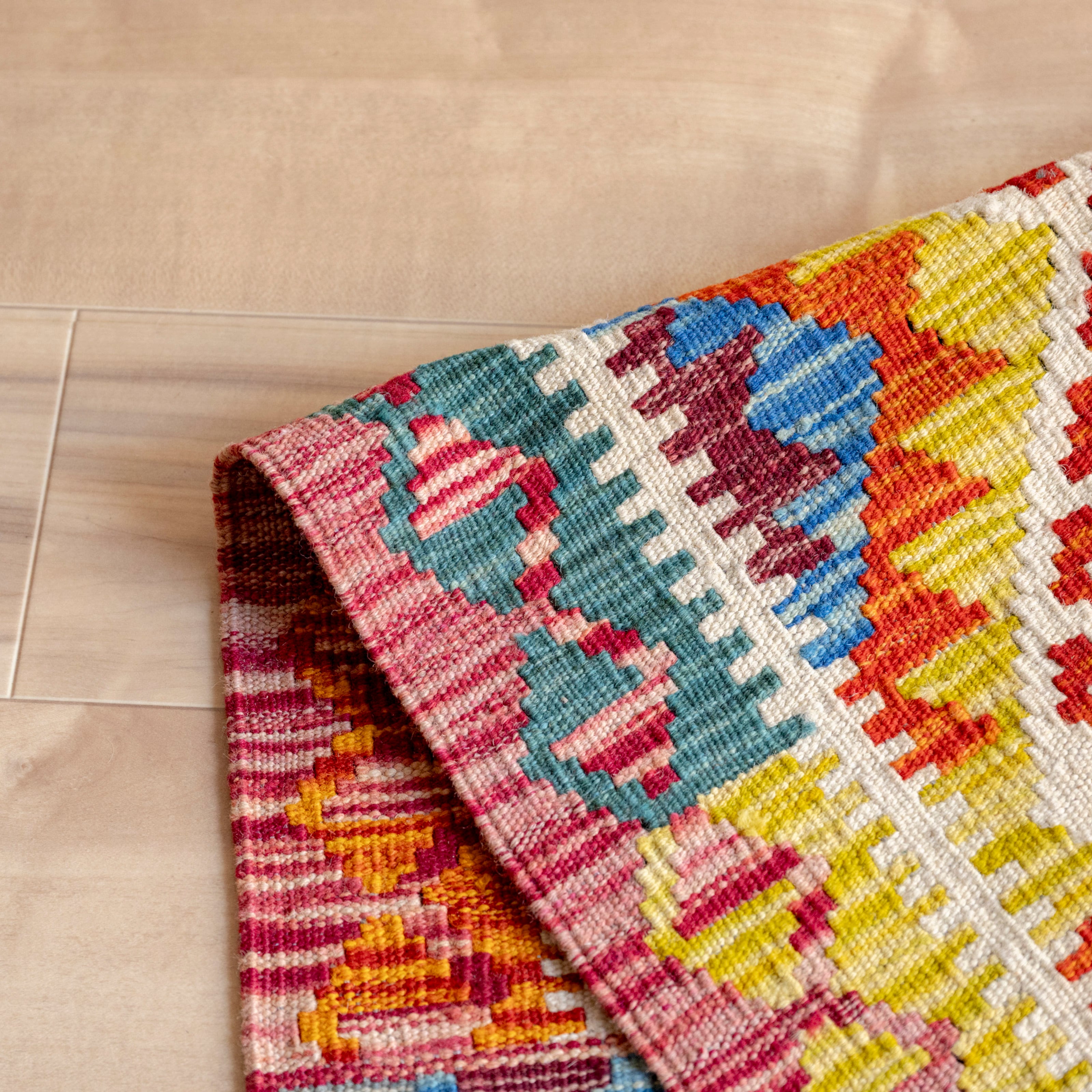 アフガニスタンで手織りでつくられた、カラフルなキリムラグ。