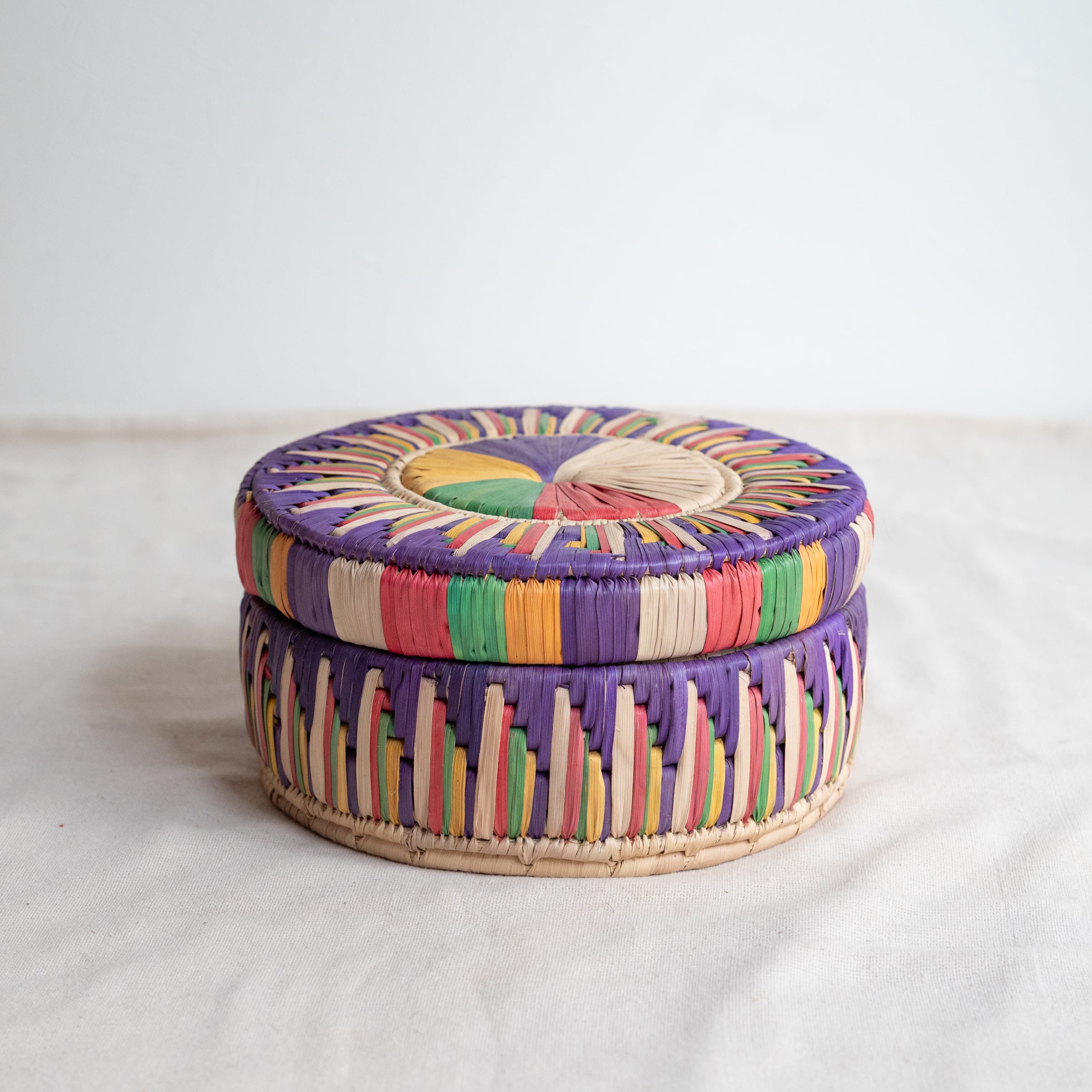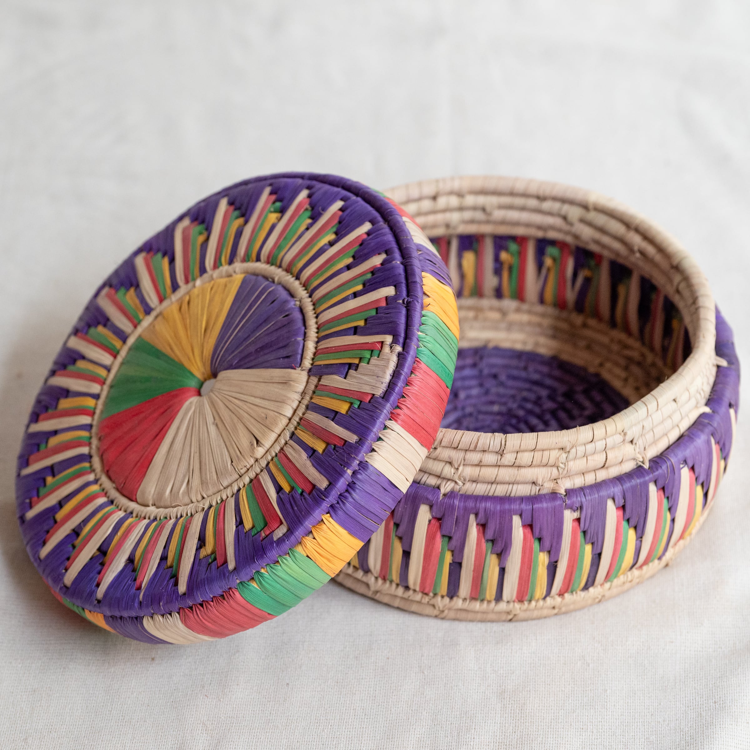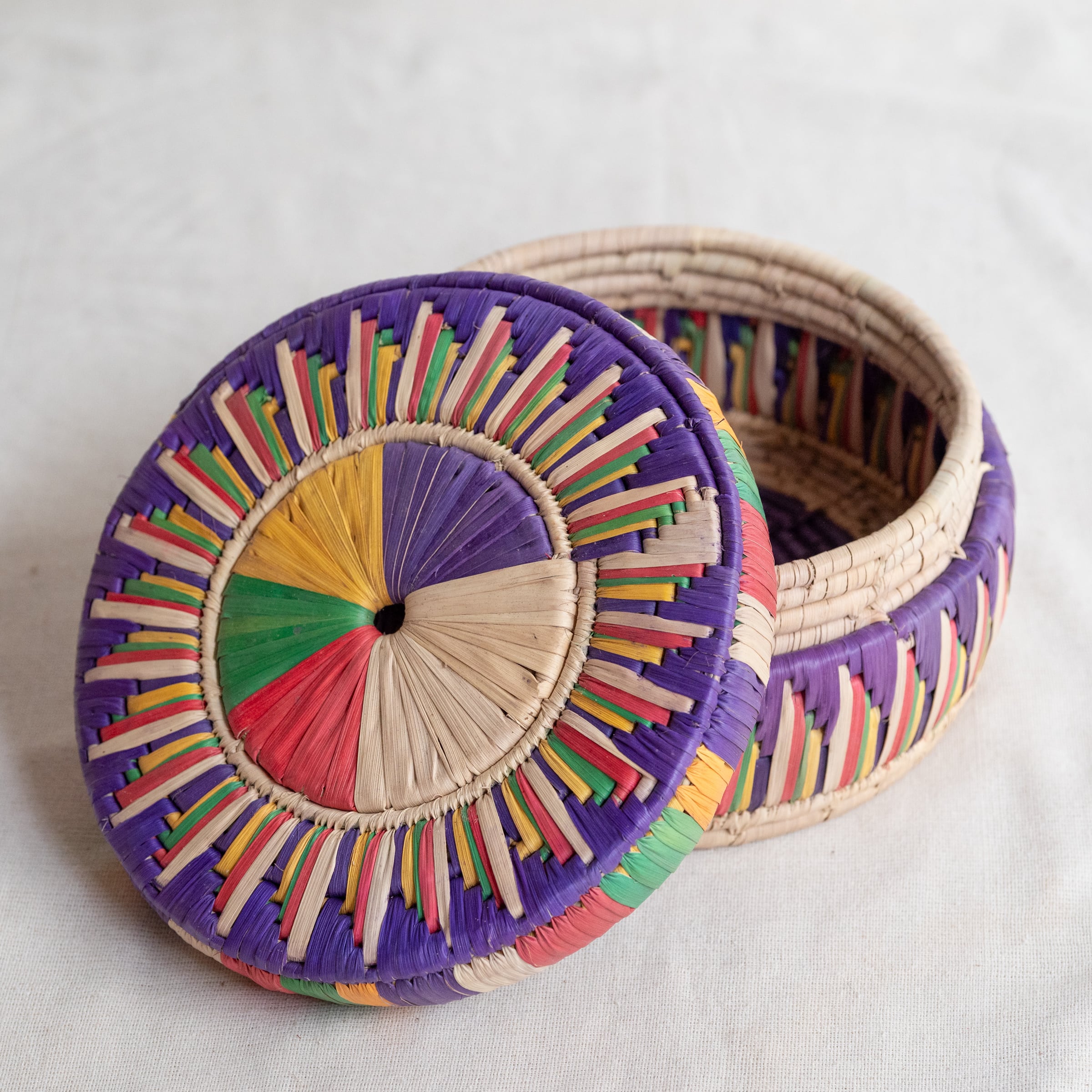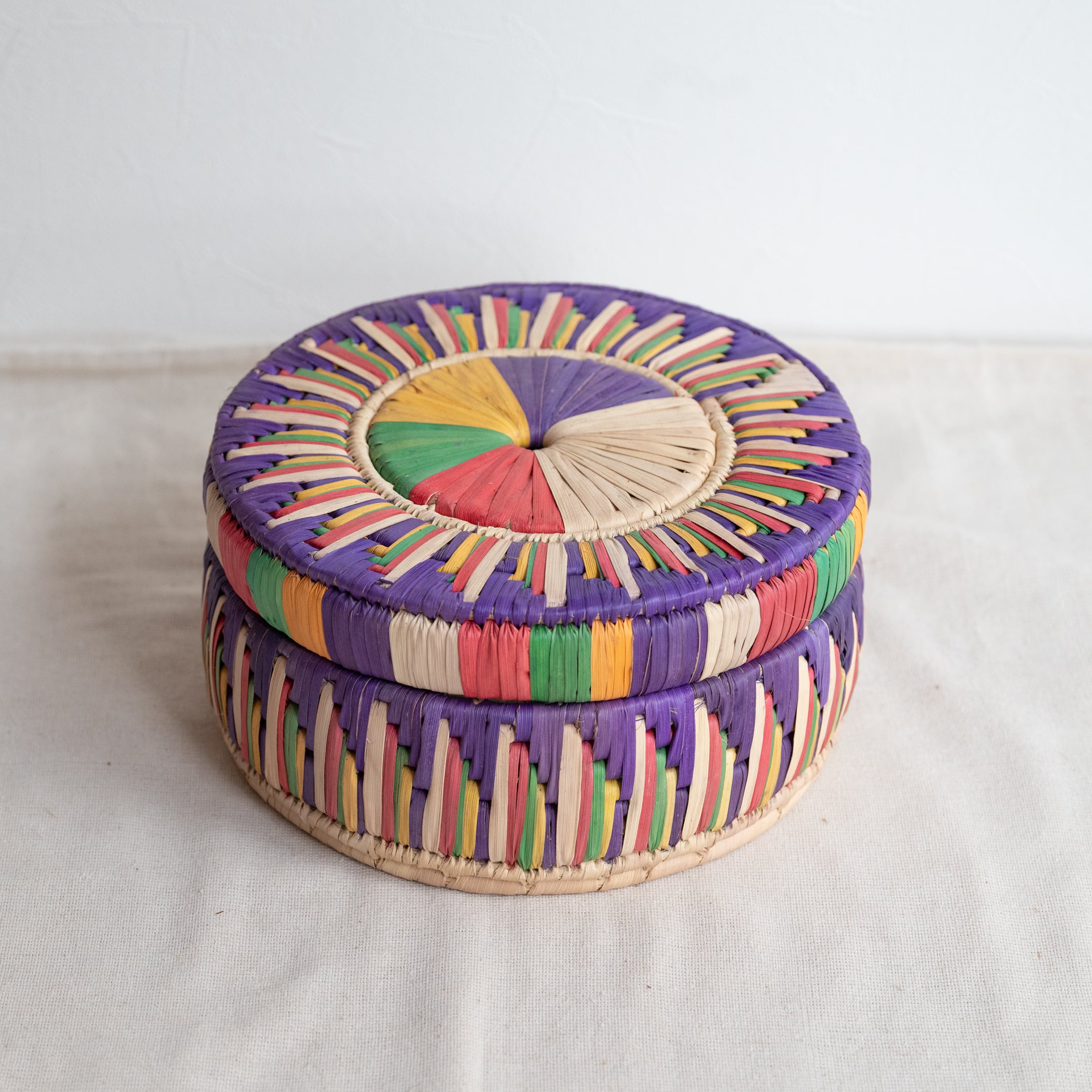 カラフルなパキスタンのかごシリーズの、フタ付きのデザインです。