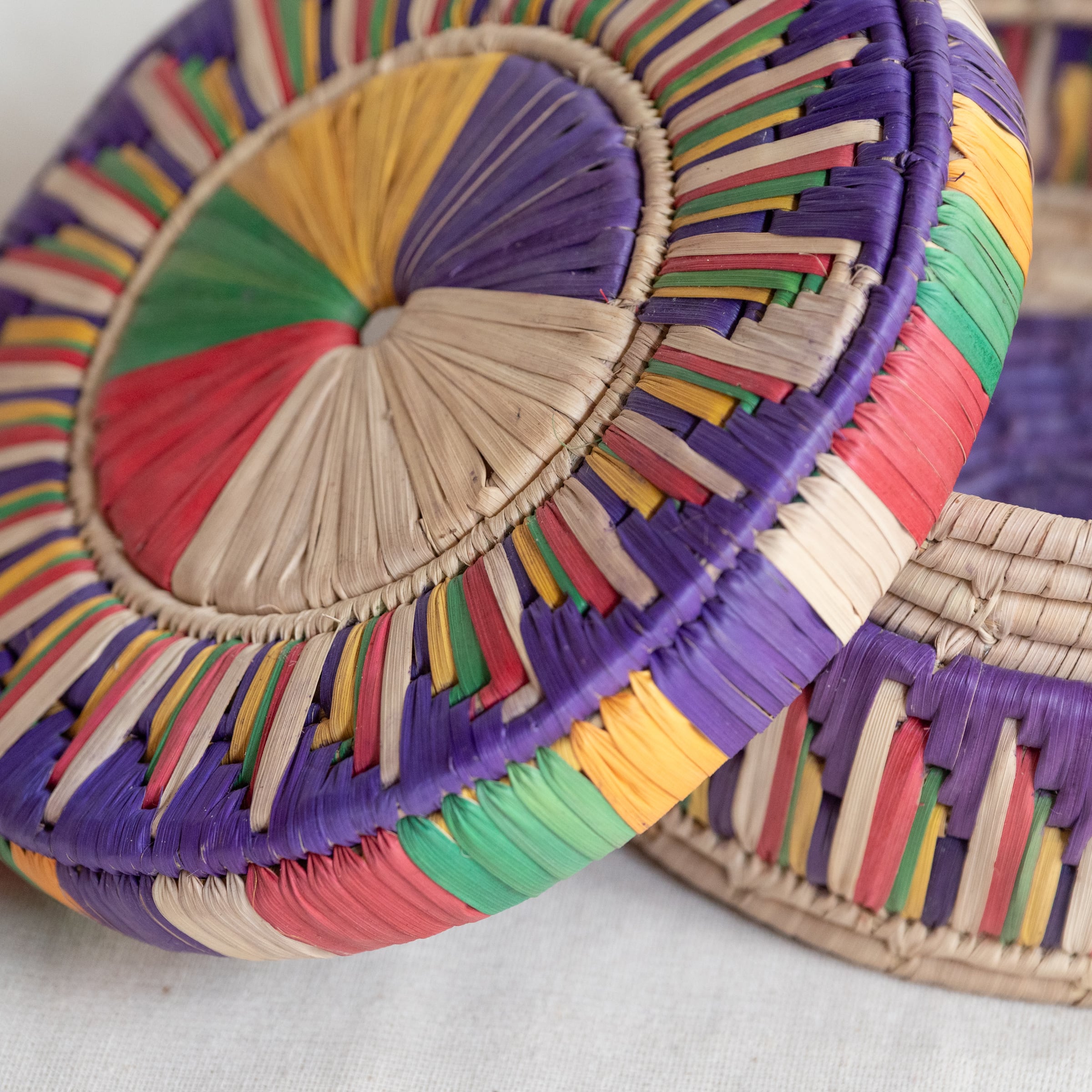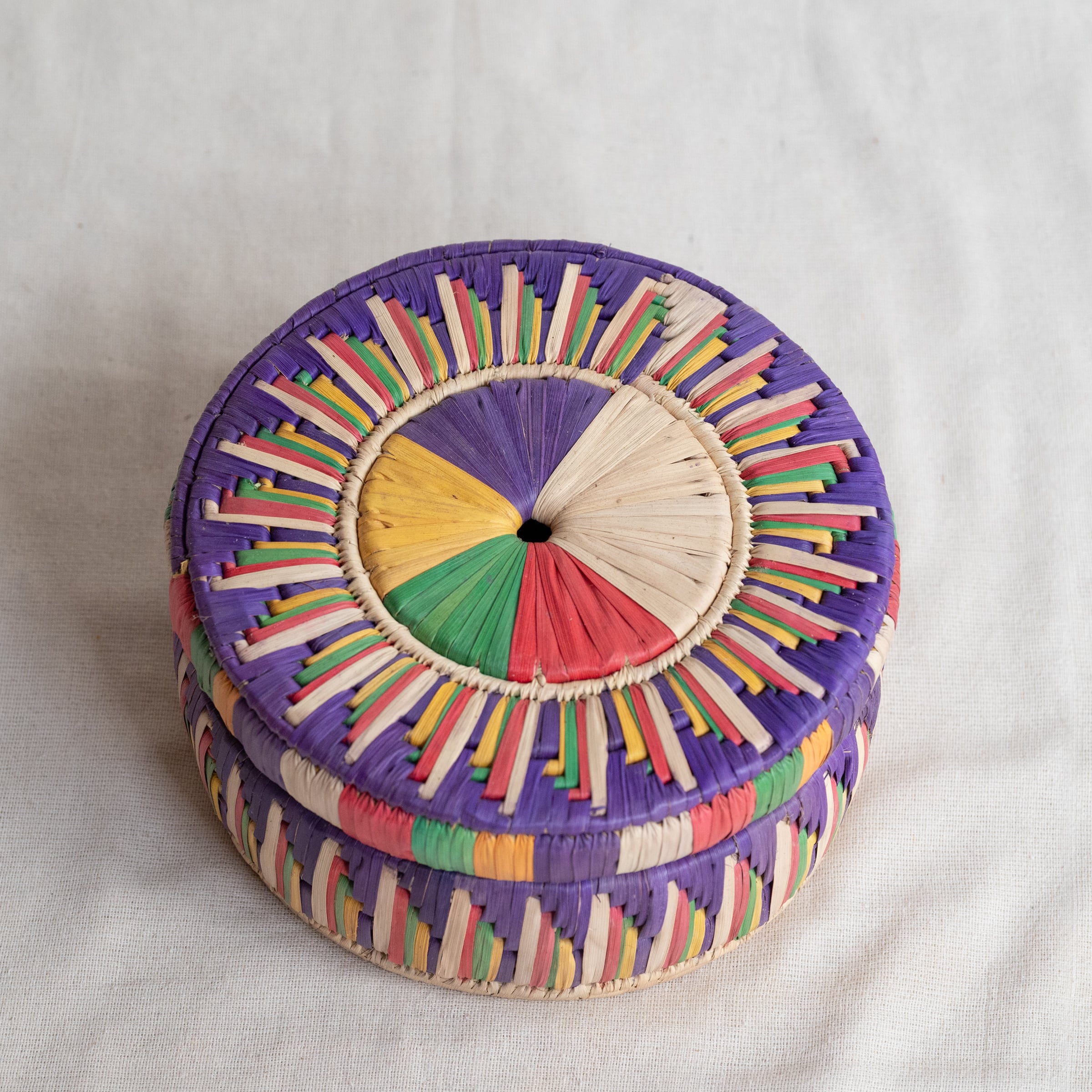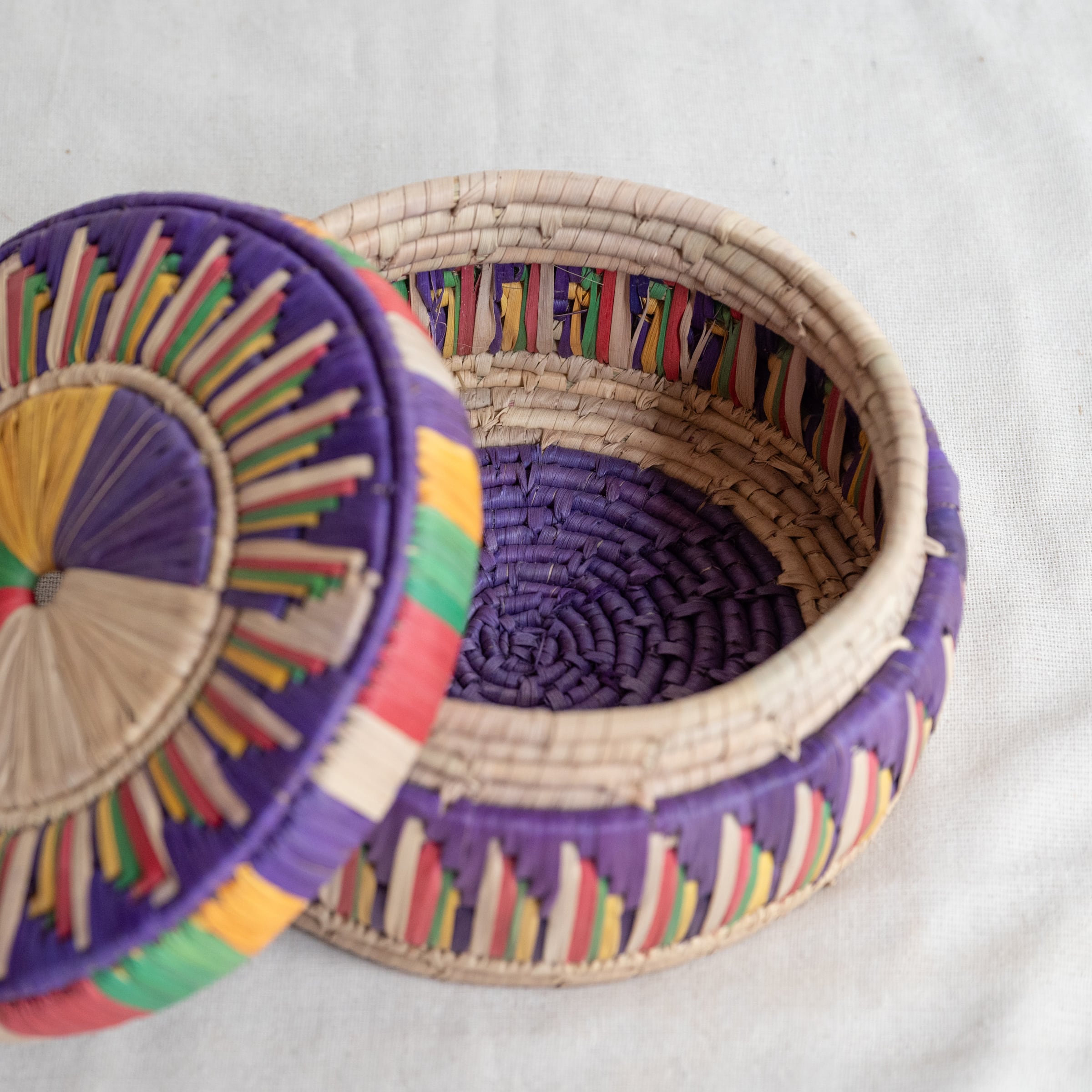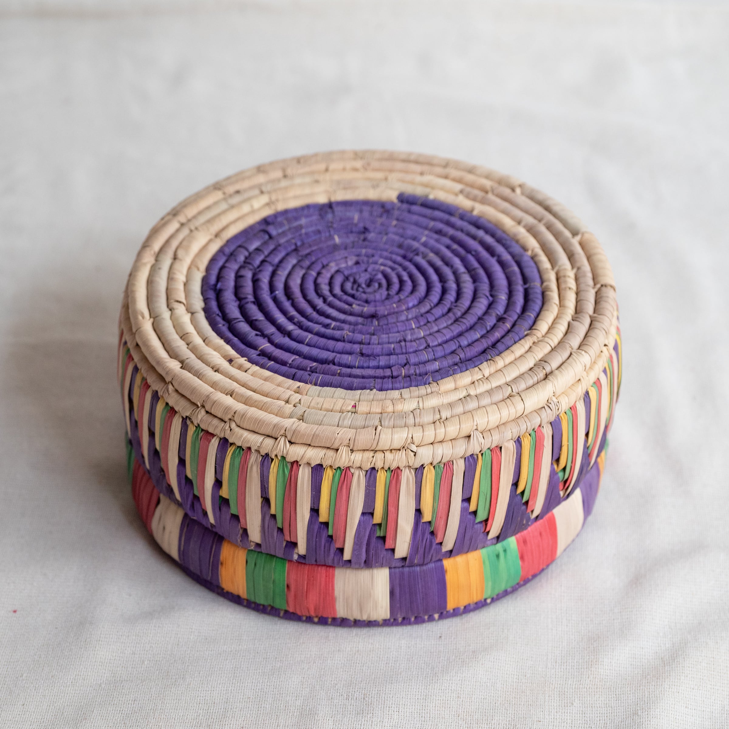 カラフルなパキスタンのかごシリーズの、フタ付きのデザインです。