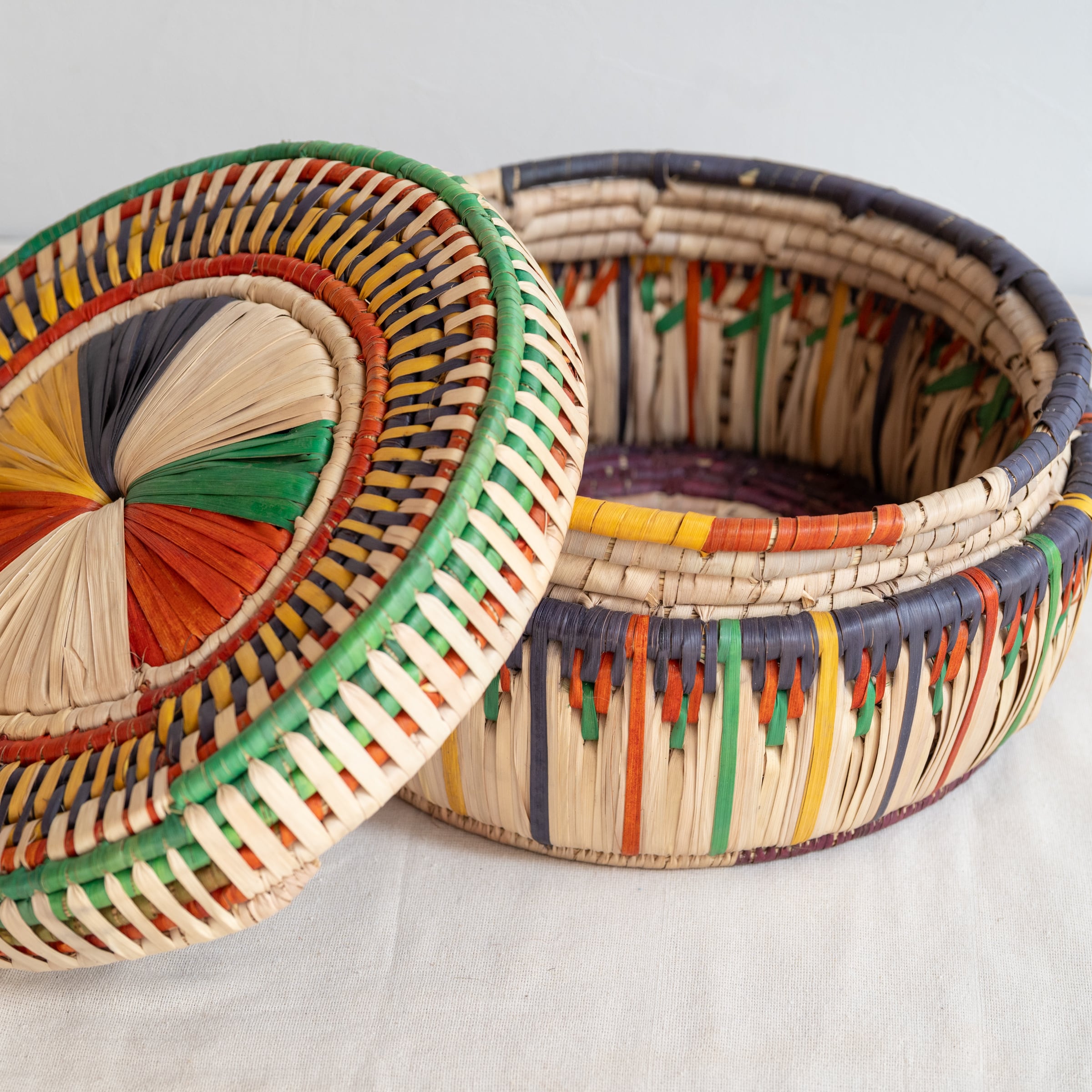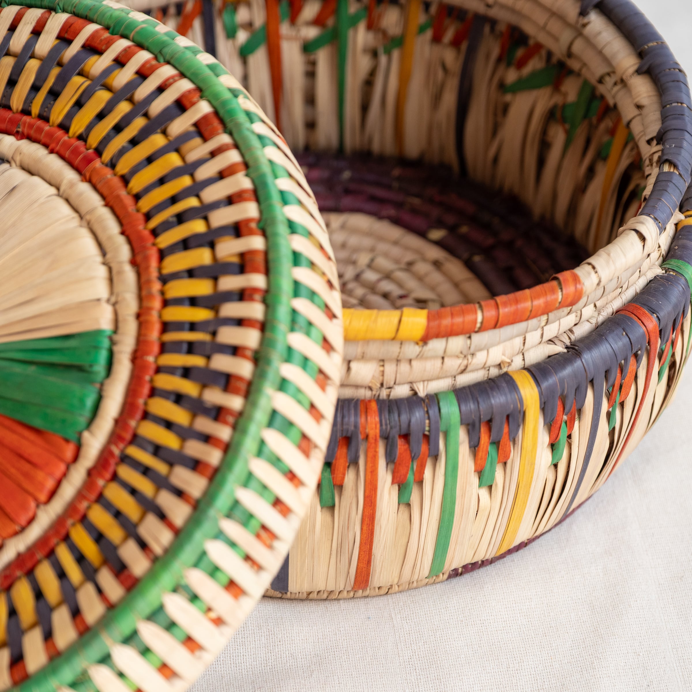 天然素材を使った、色鮮やかで、様々な柄があるこのかごは、