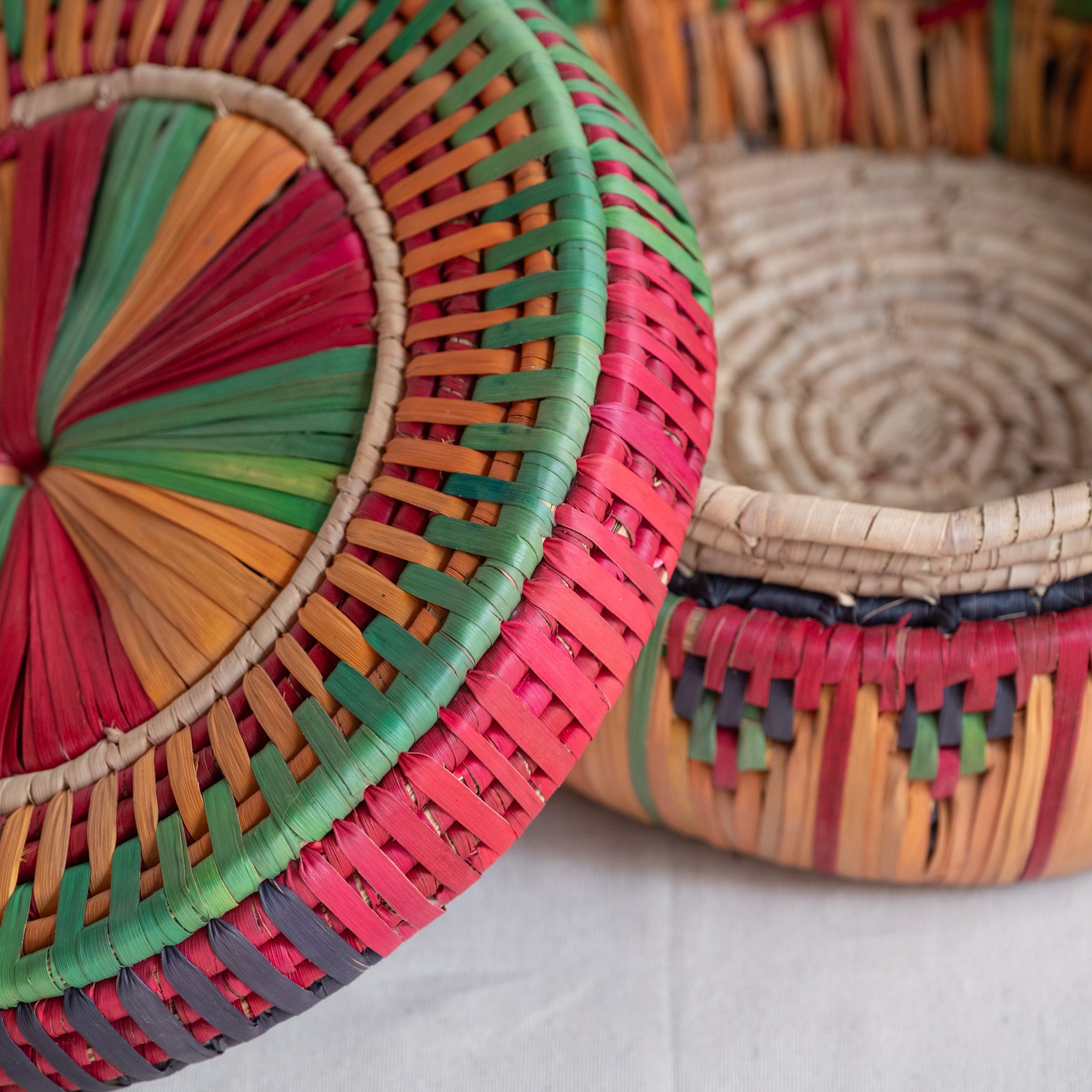 天然素材を使った、色鮮やかで、様々な柄があるこのかごは、