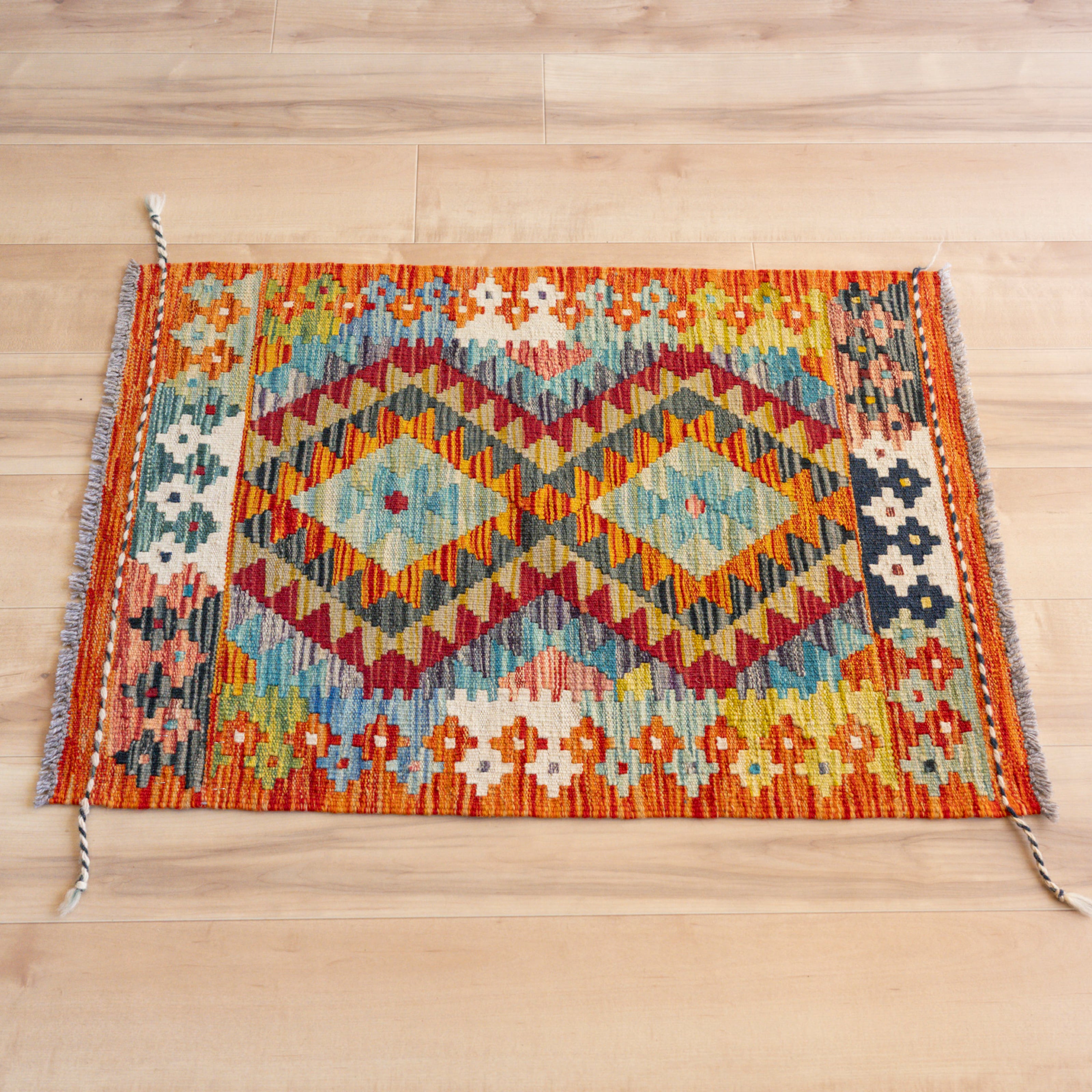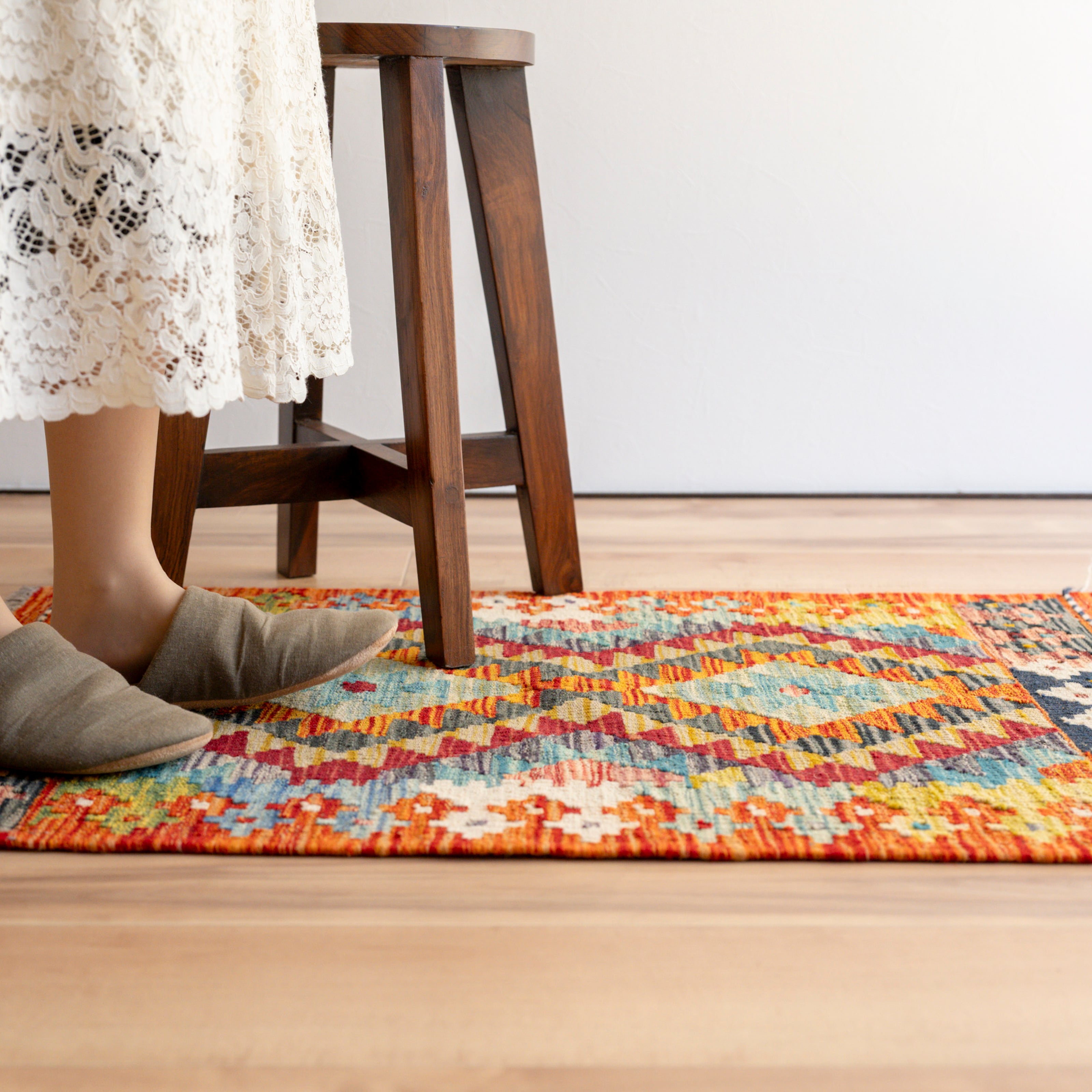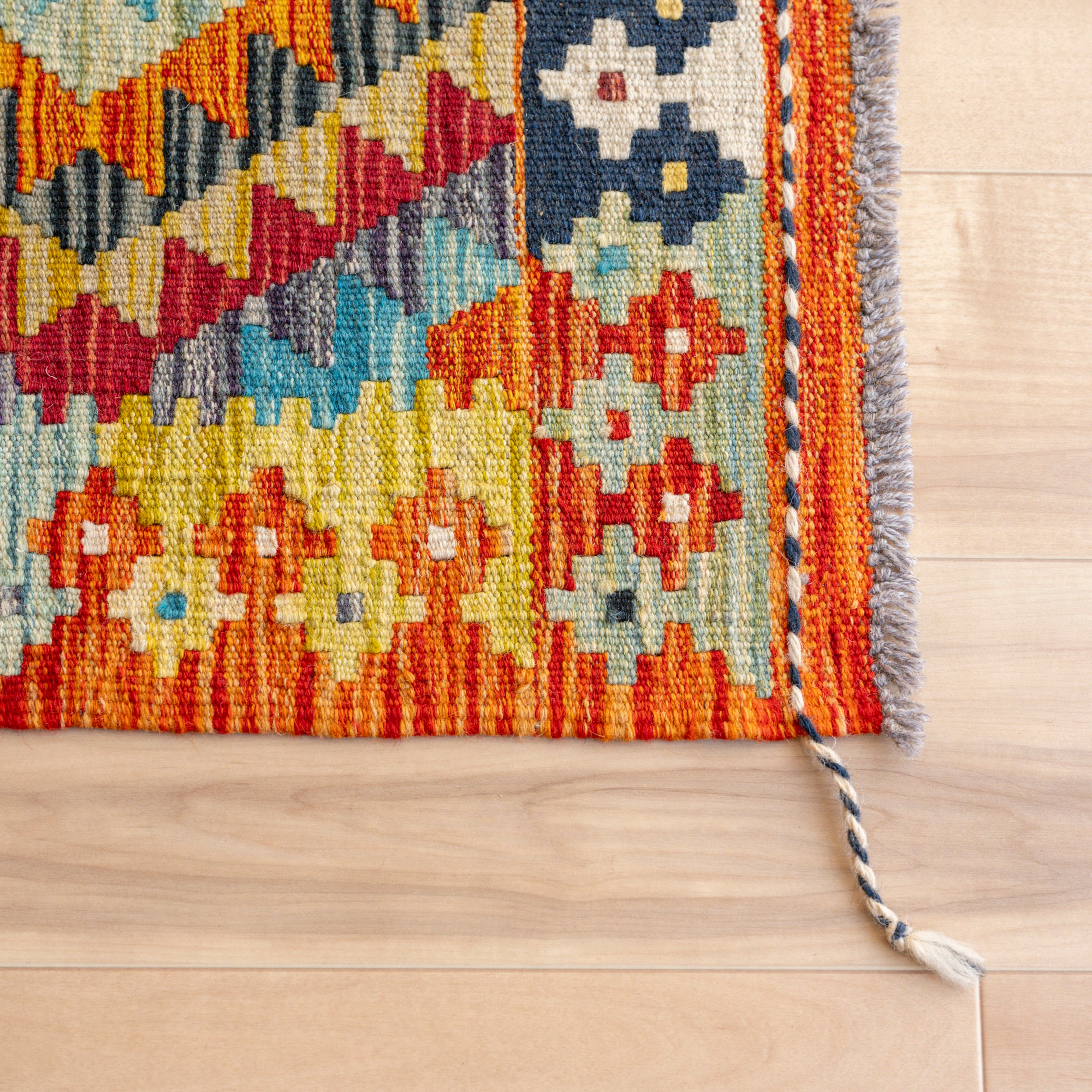 アフガニスタンで手織りでつくられた、カラフルなキリムラグ。