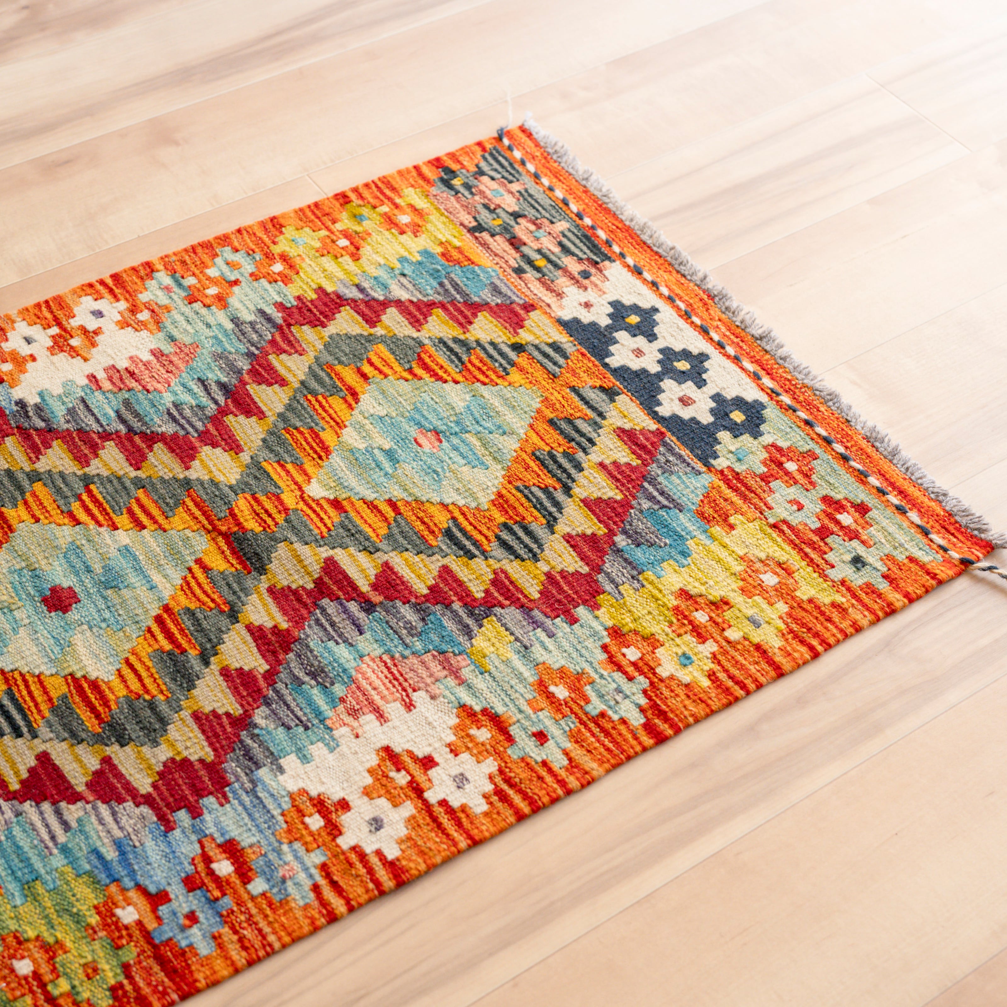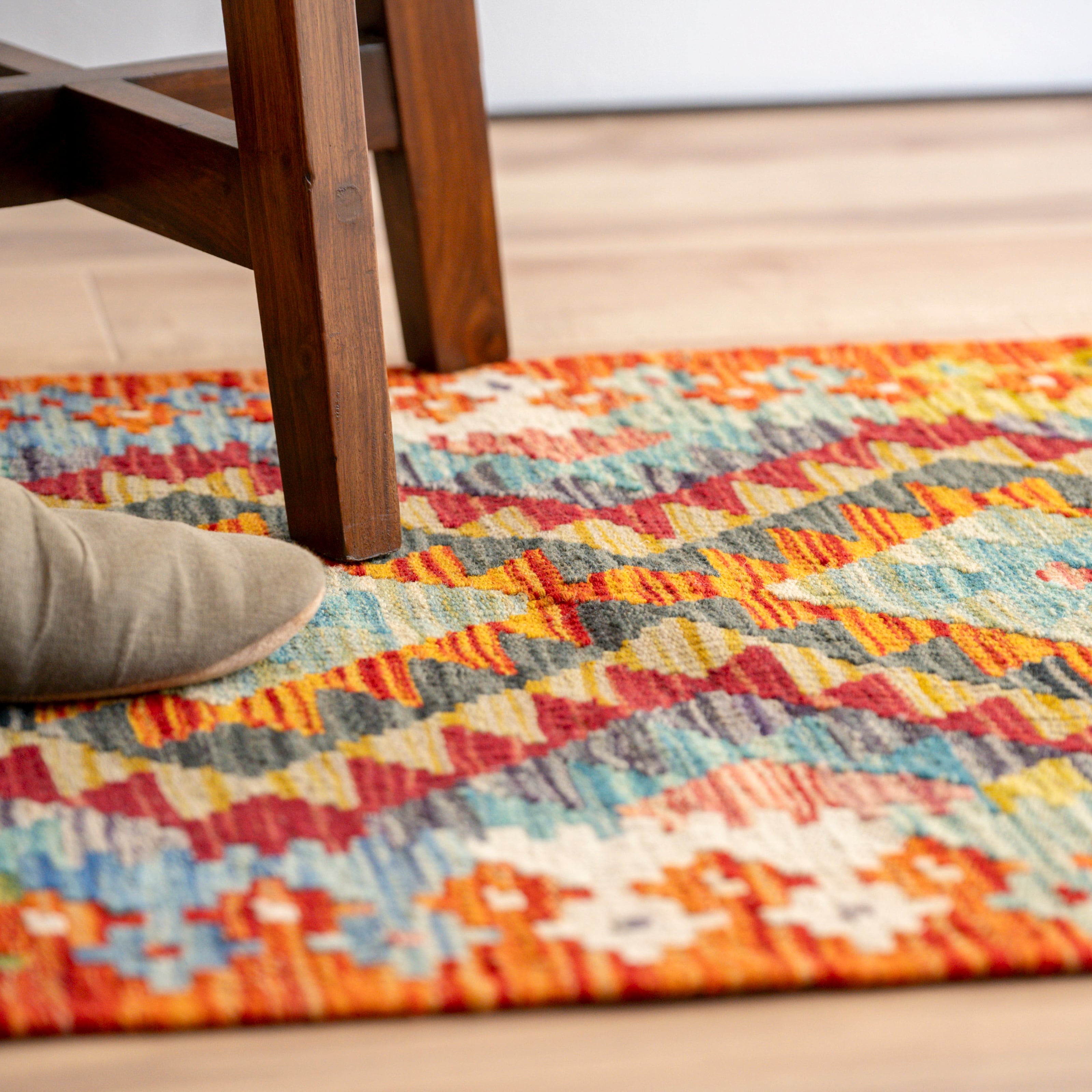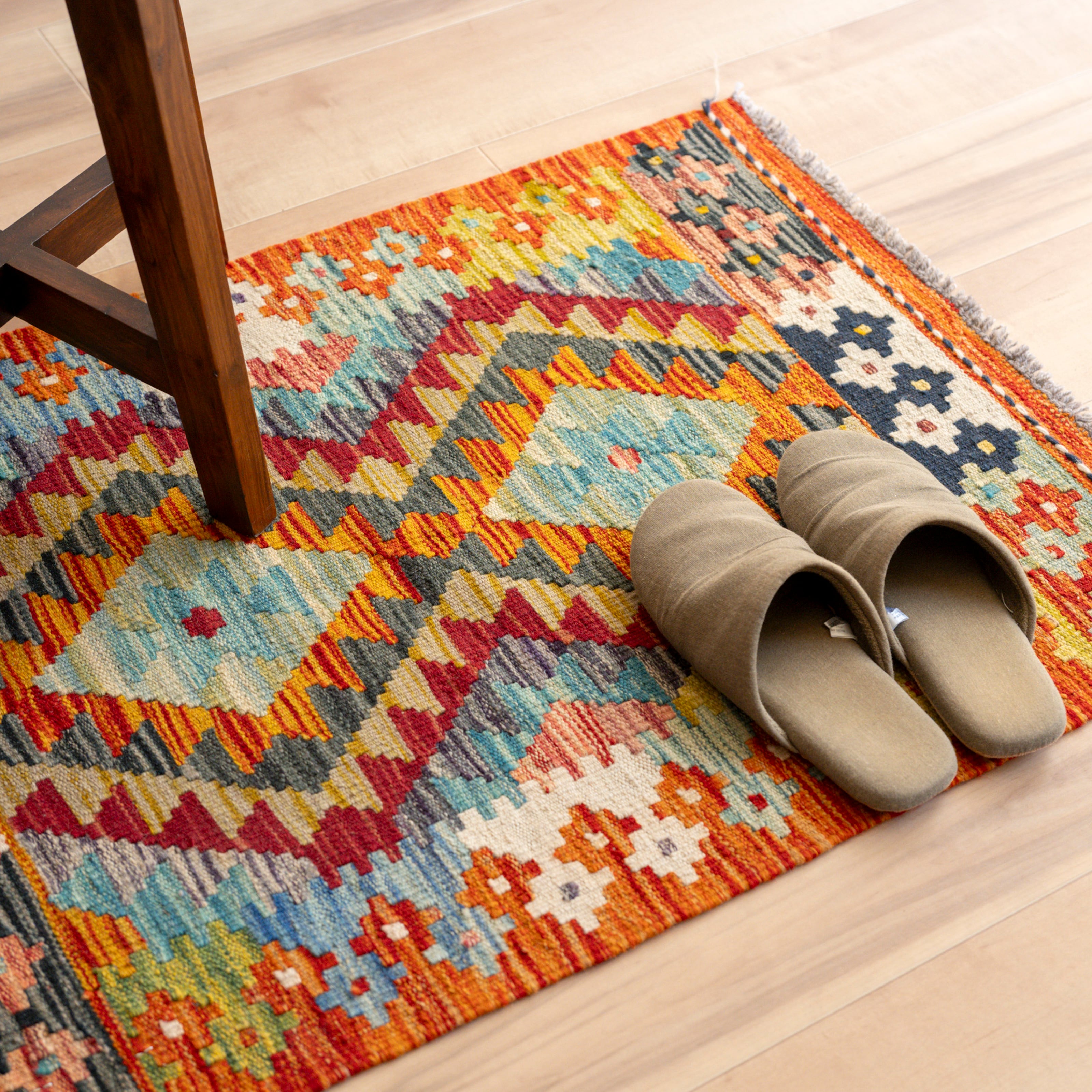 アフガニスタンで手織りでつくられた、カラフルなキリムラグ。
