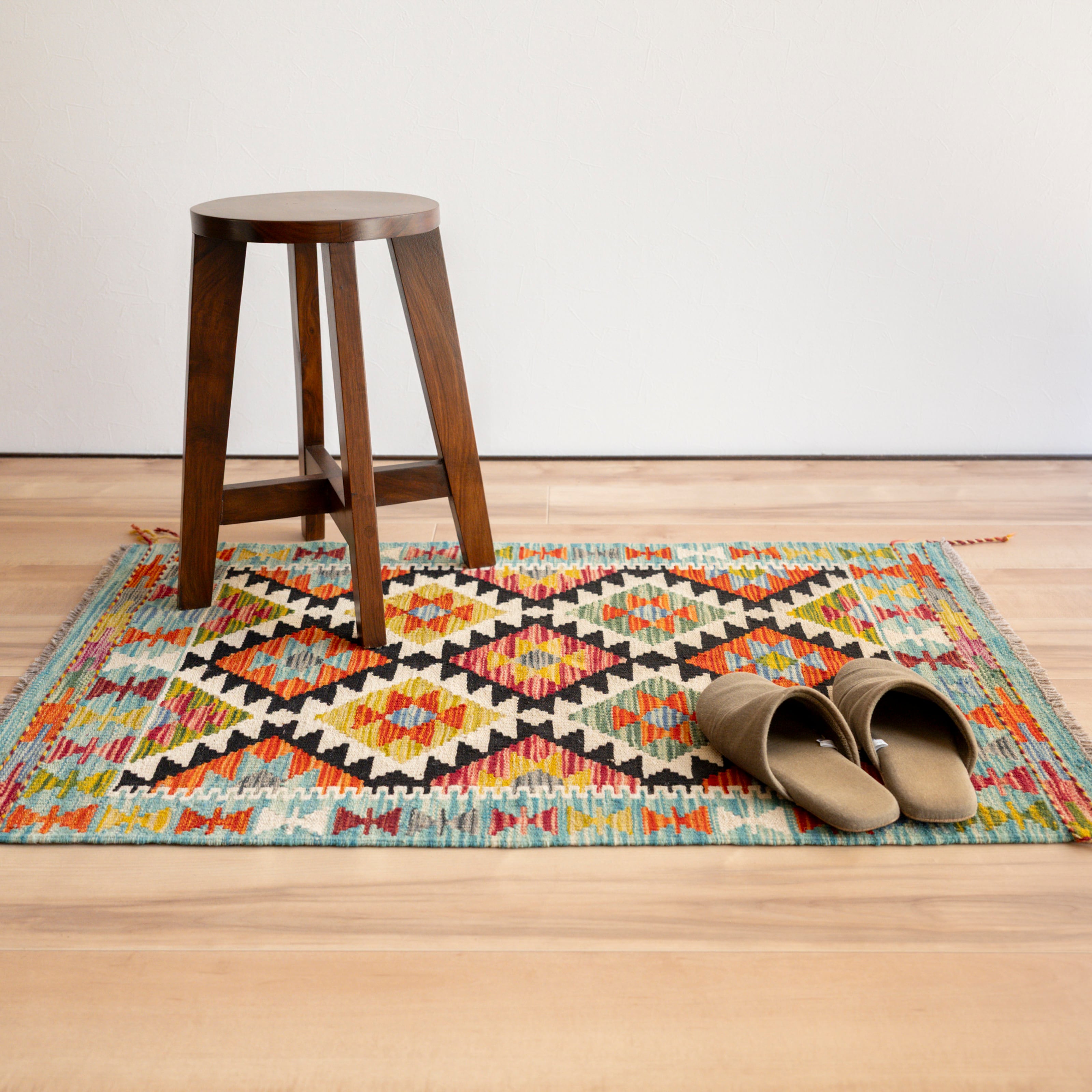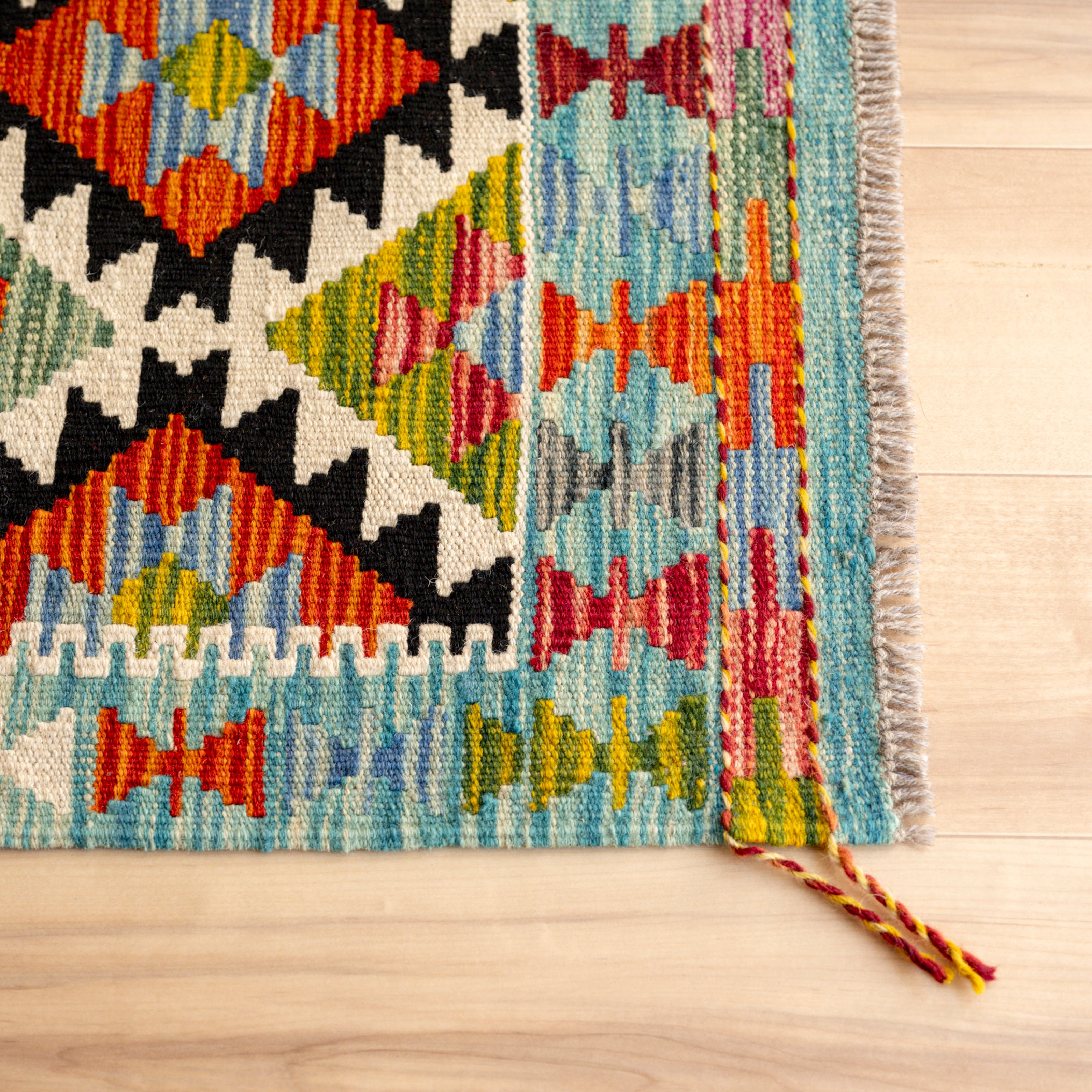 アフガニスタンで手織りでつくられた、カラフルなキリムラグ。