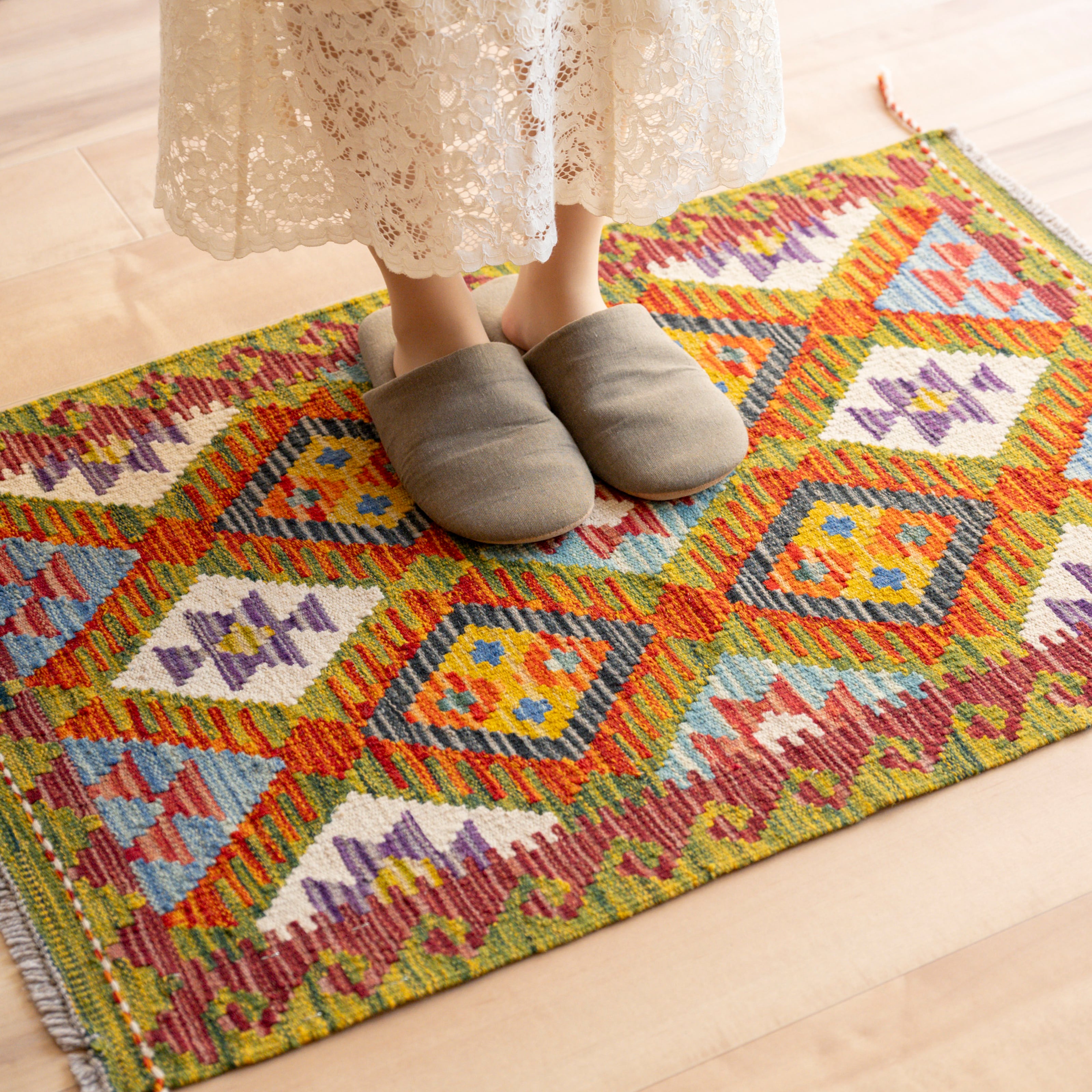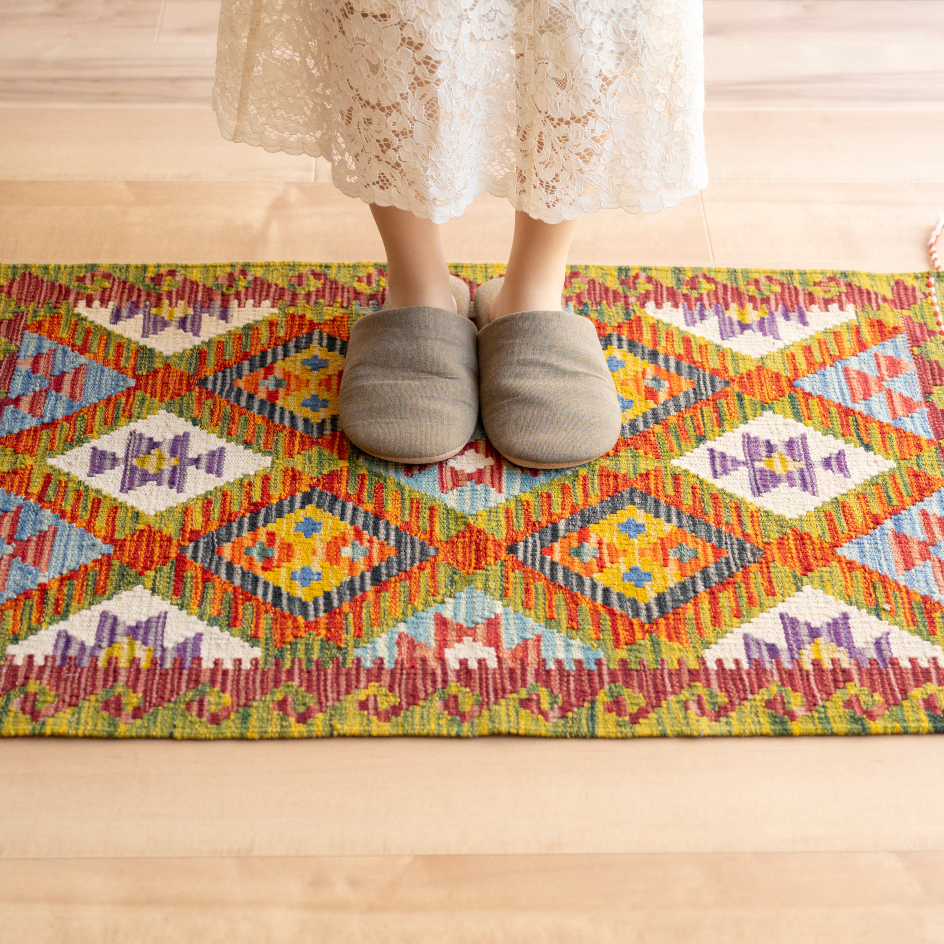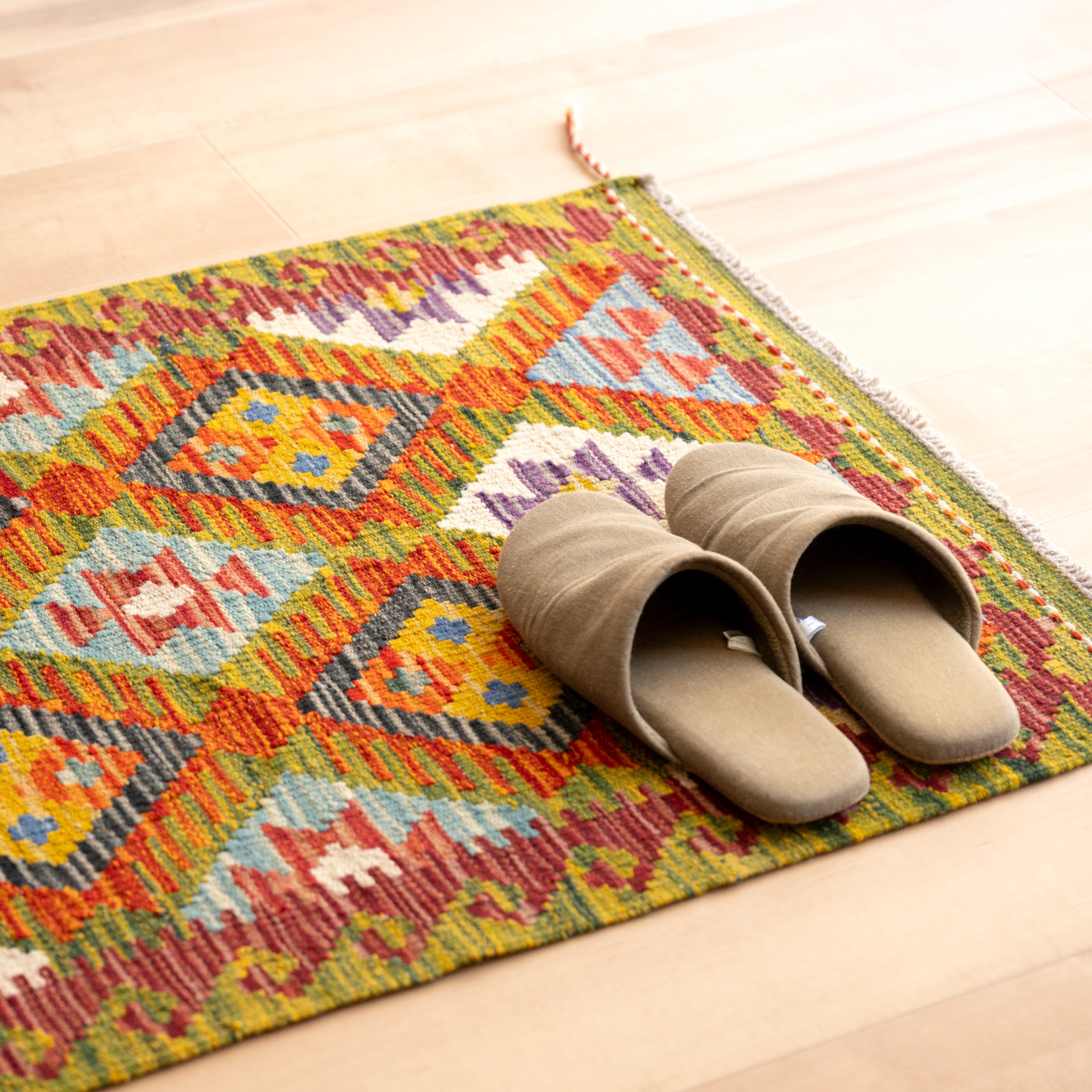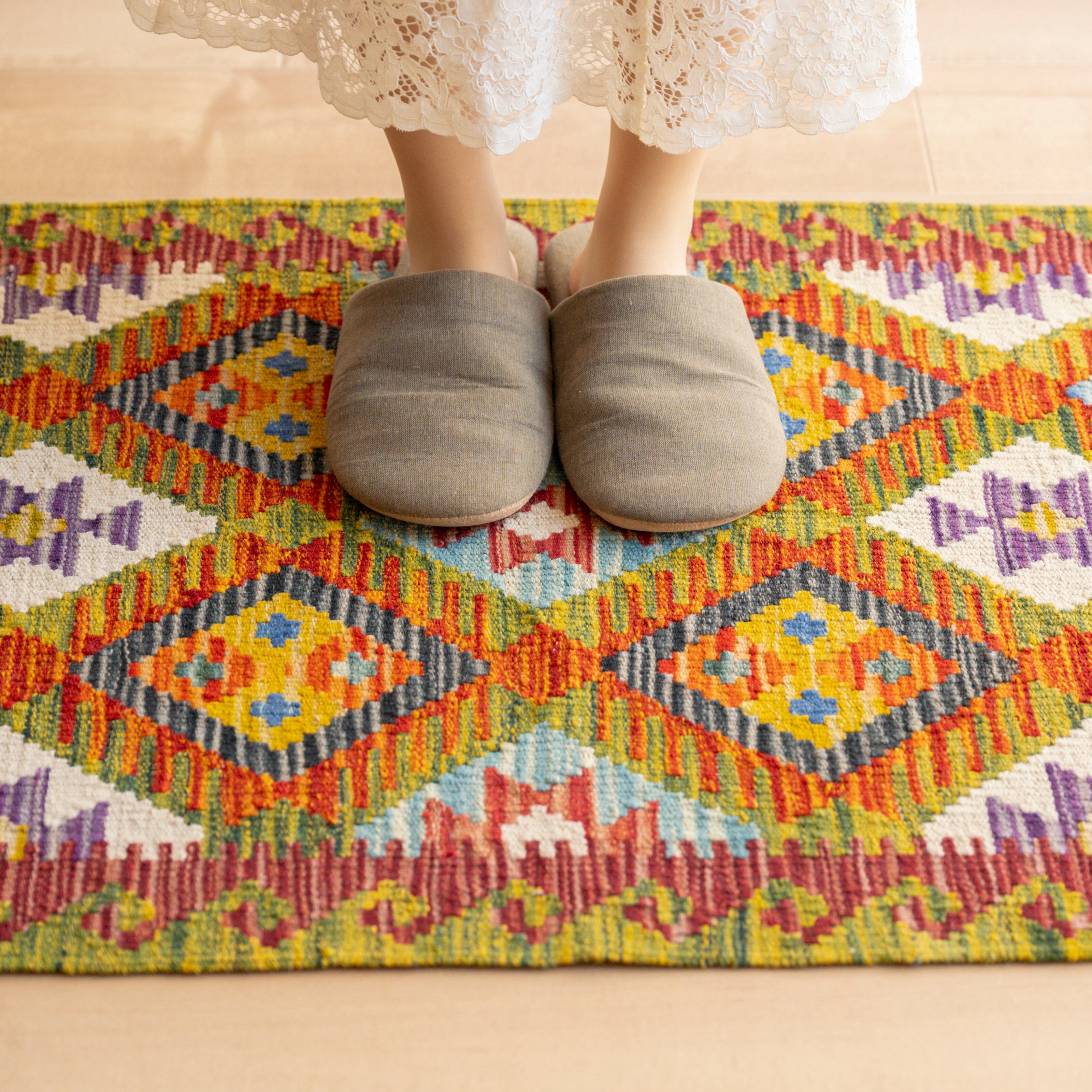 初めて素足でキリムに足をのせると、ちょっとゴワゴワした印象があるかもしれません。