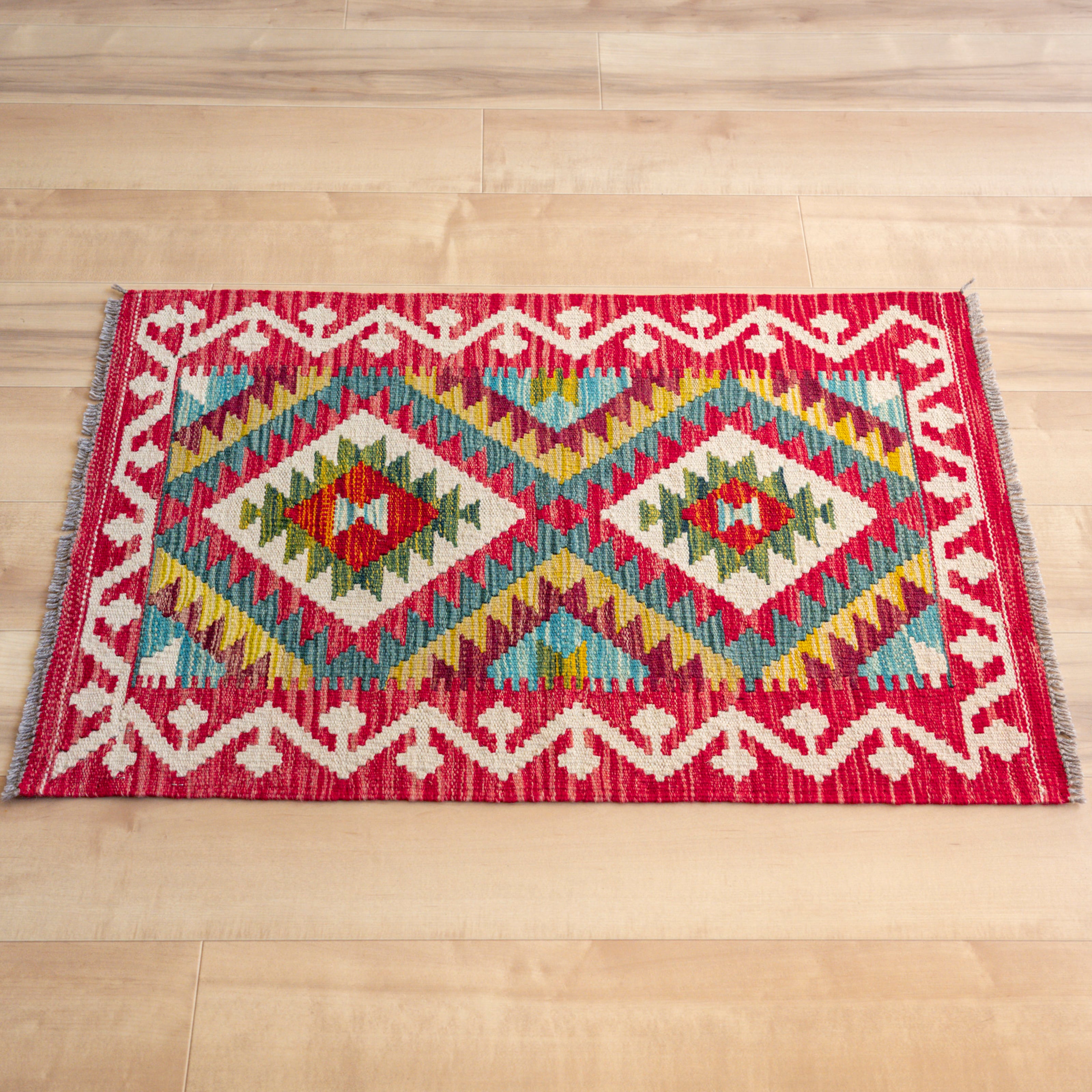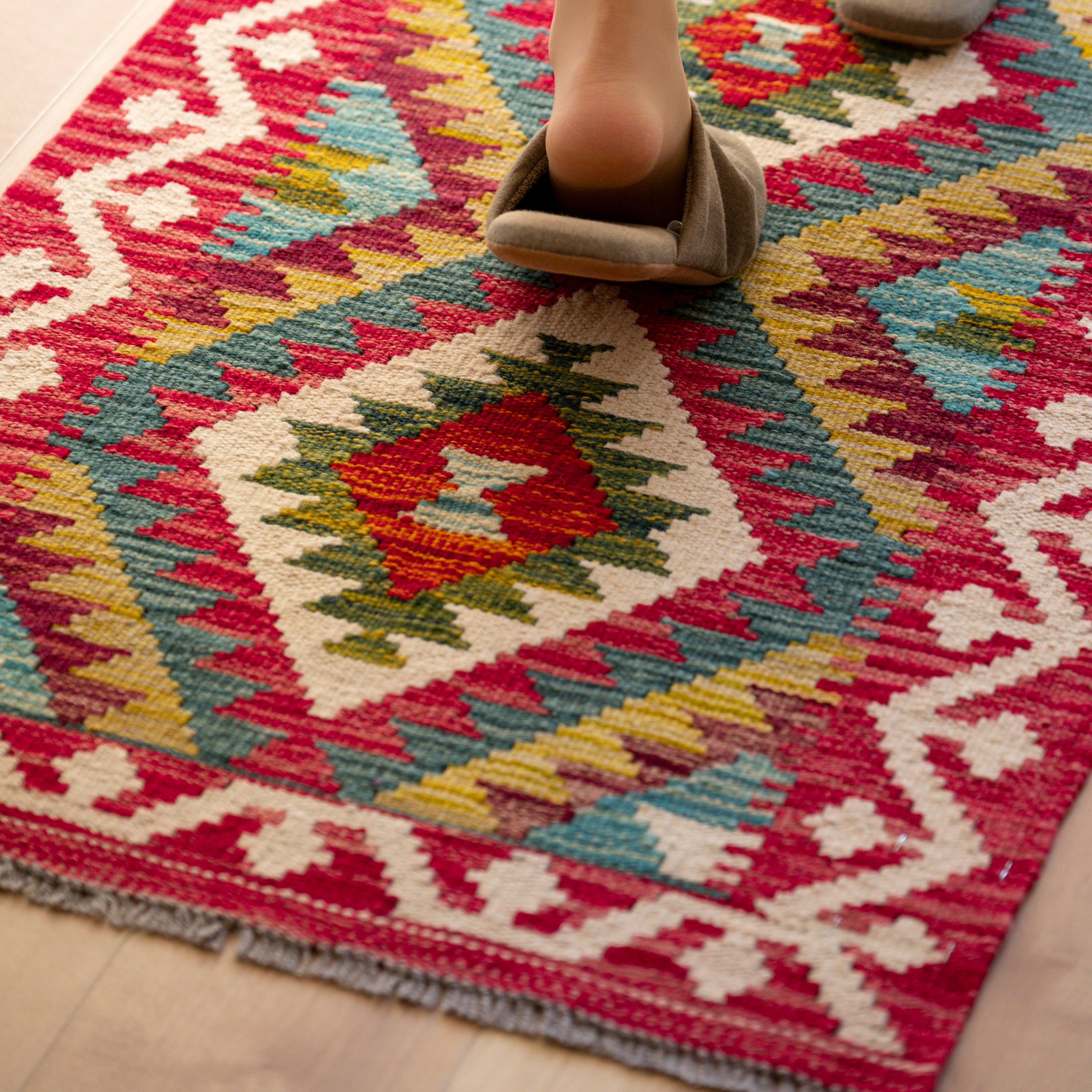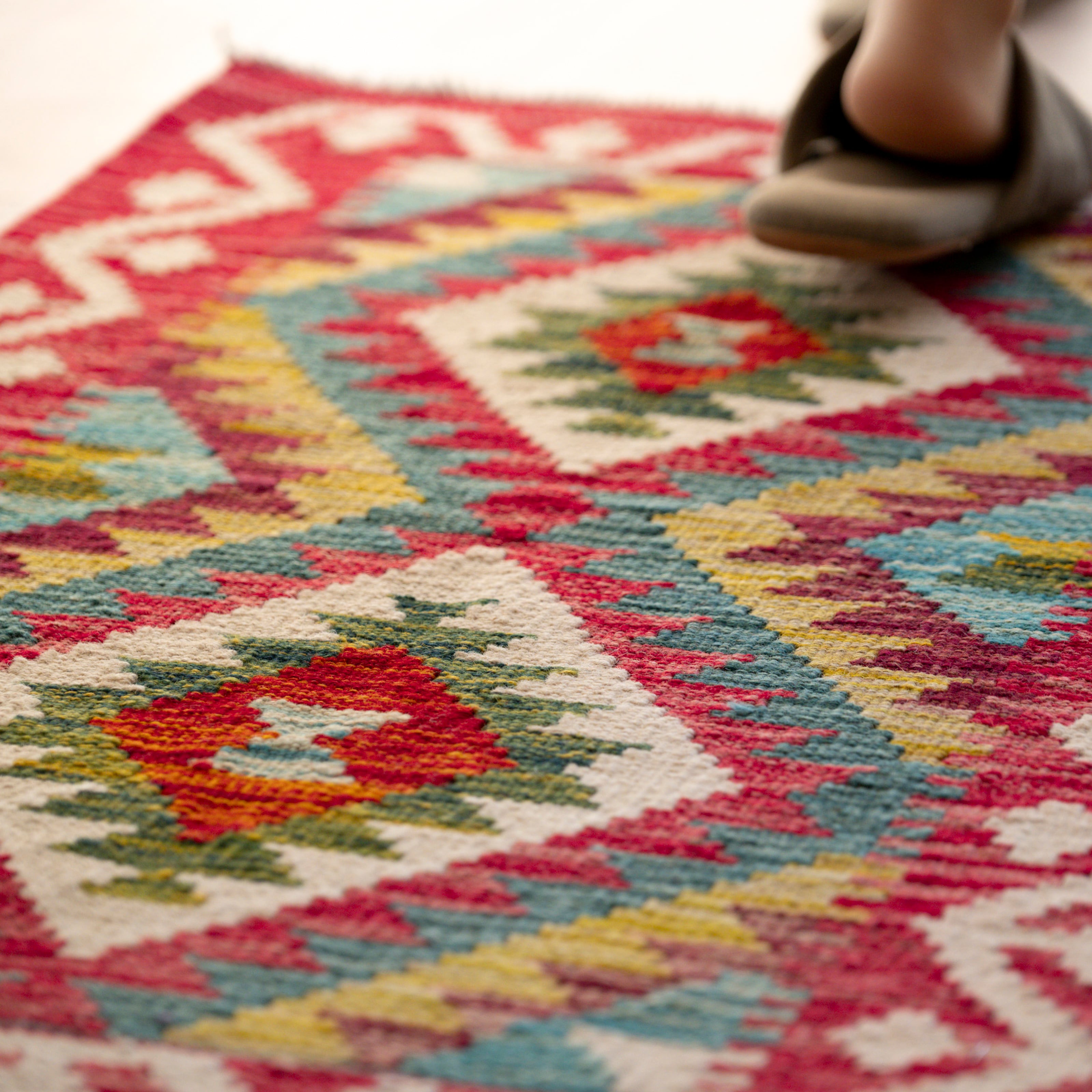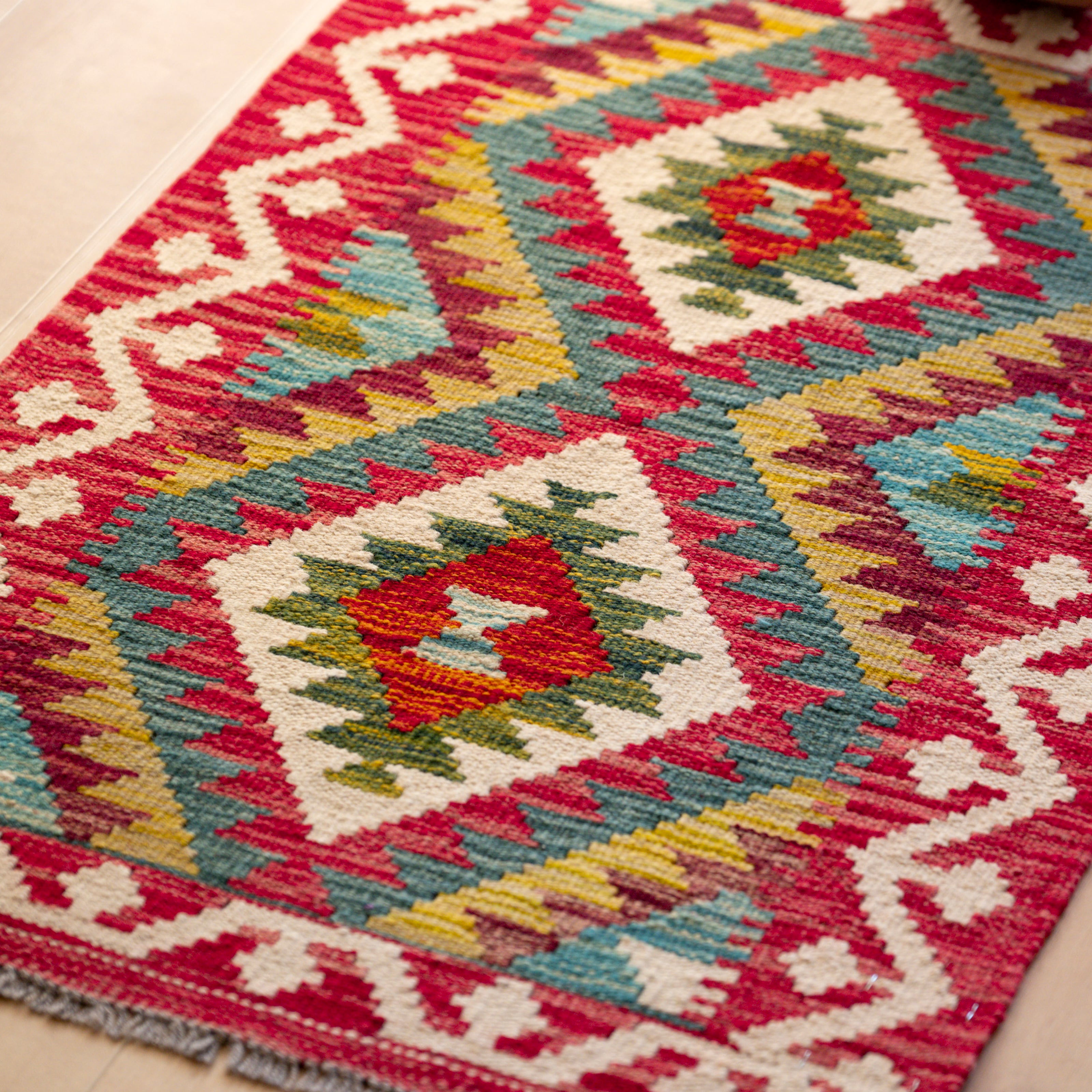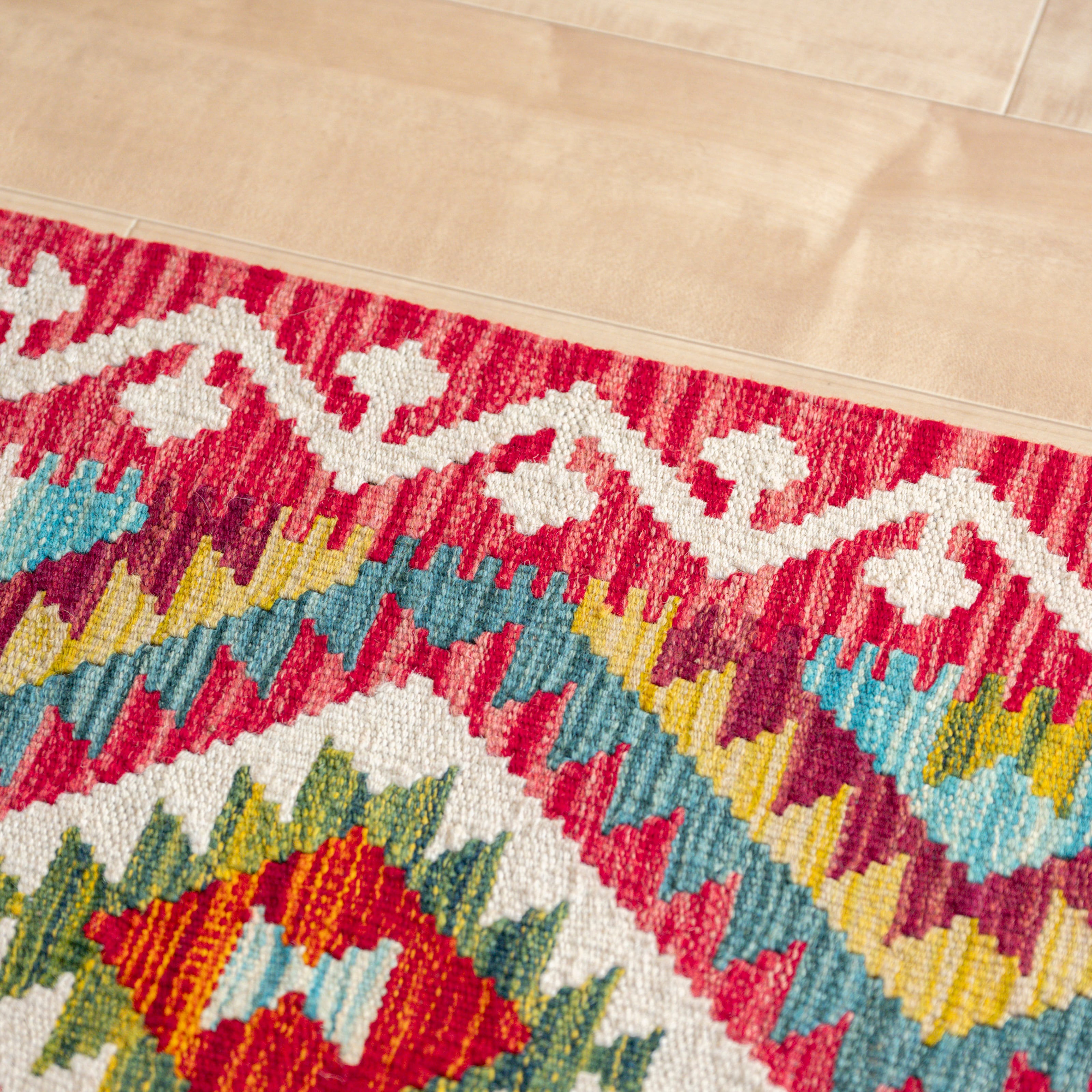アフガニスタンで手織りでつくられた、カラフルなキリムラグ。