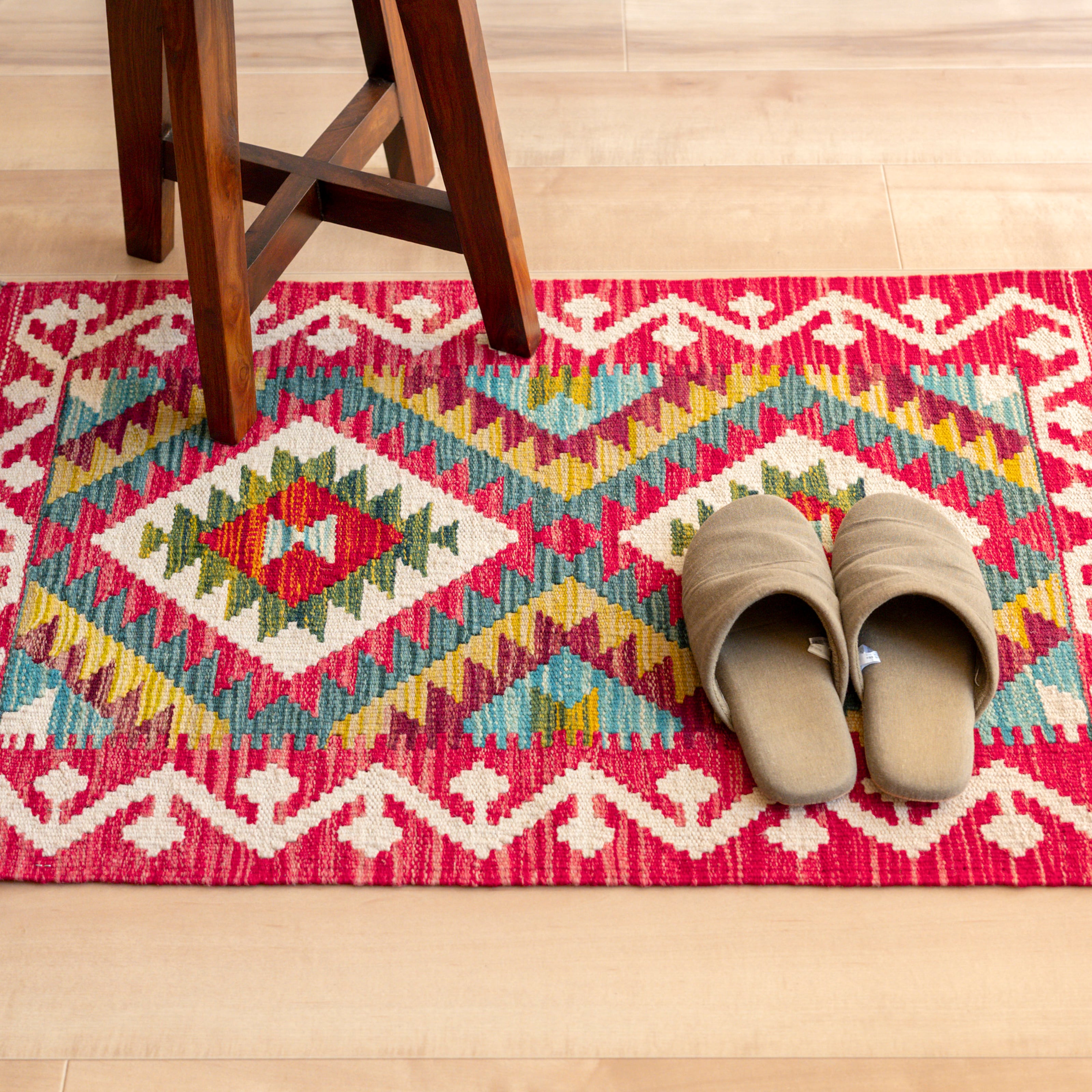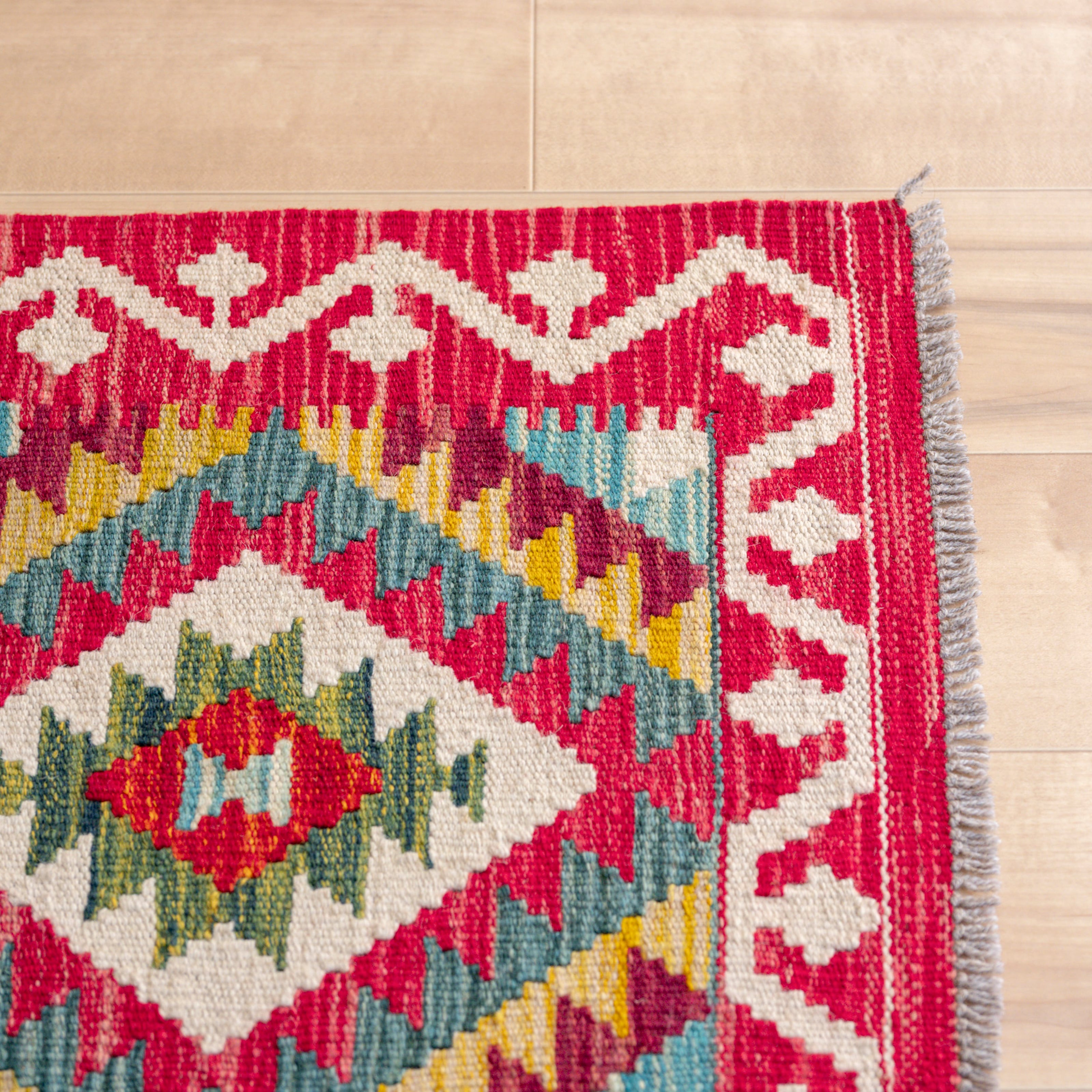 カラフルなキリムは、鮮やかに染めたウールで織る幾何学模様が特徴的ですが、