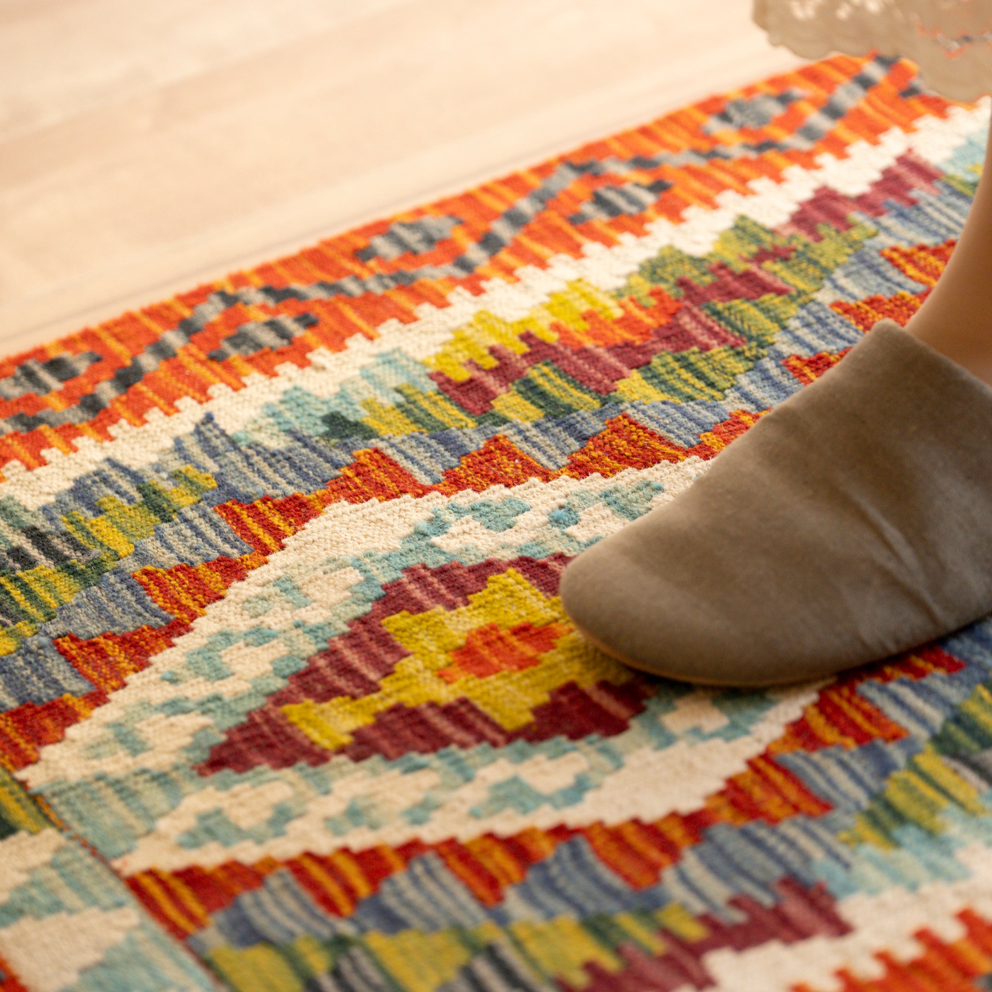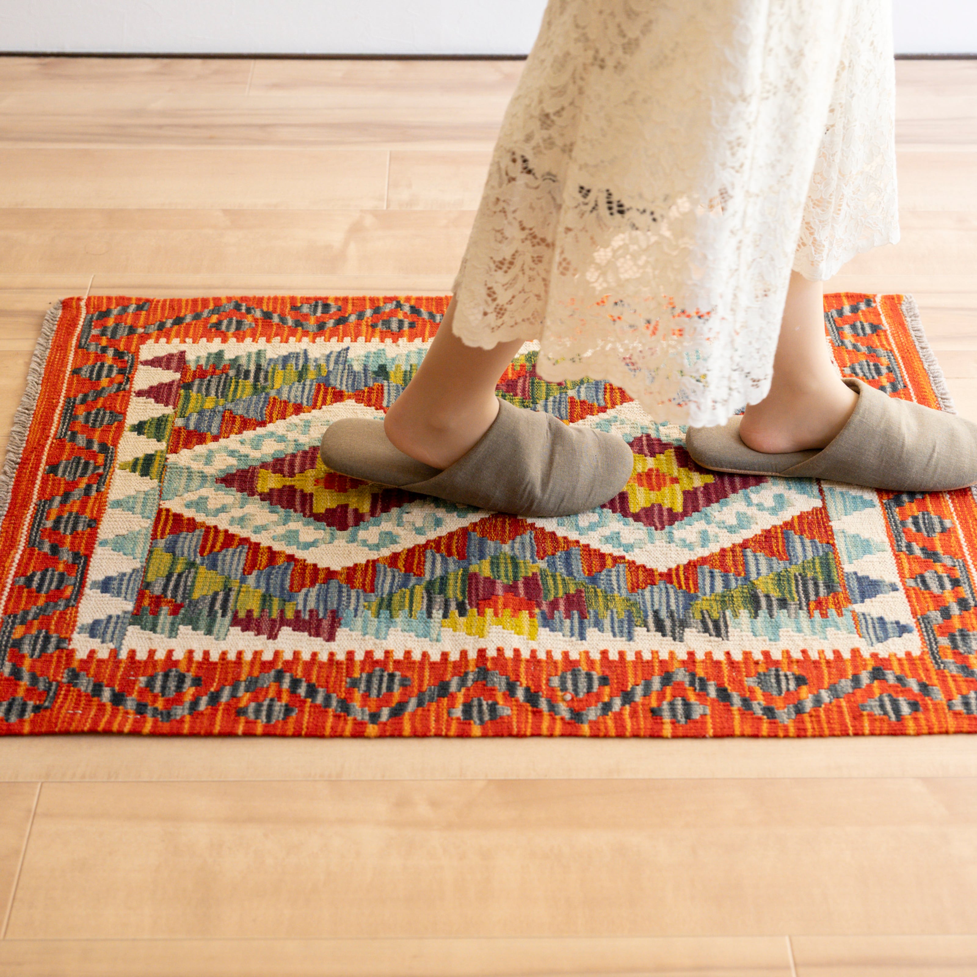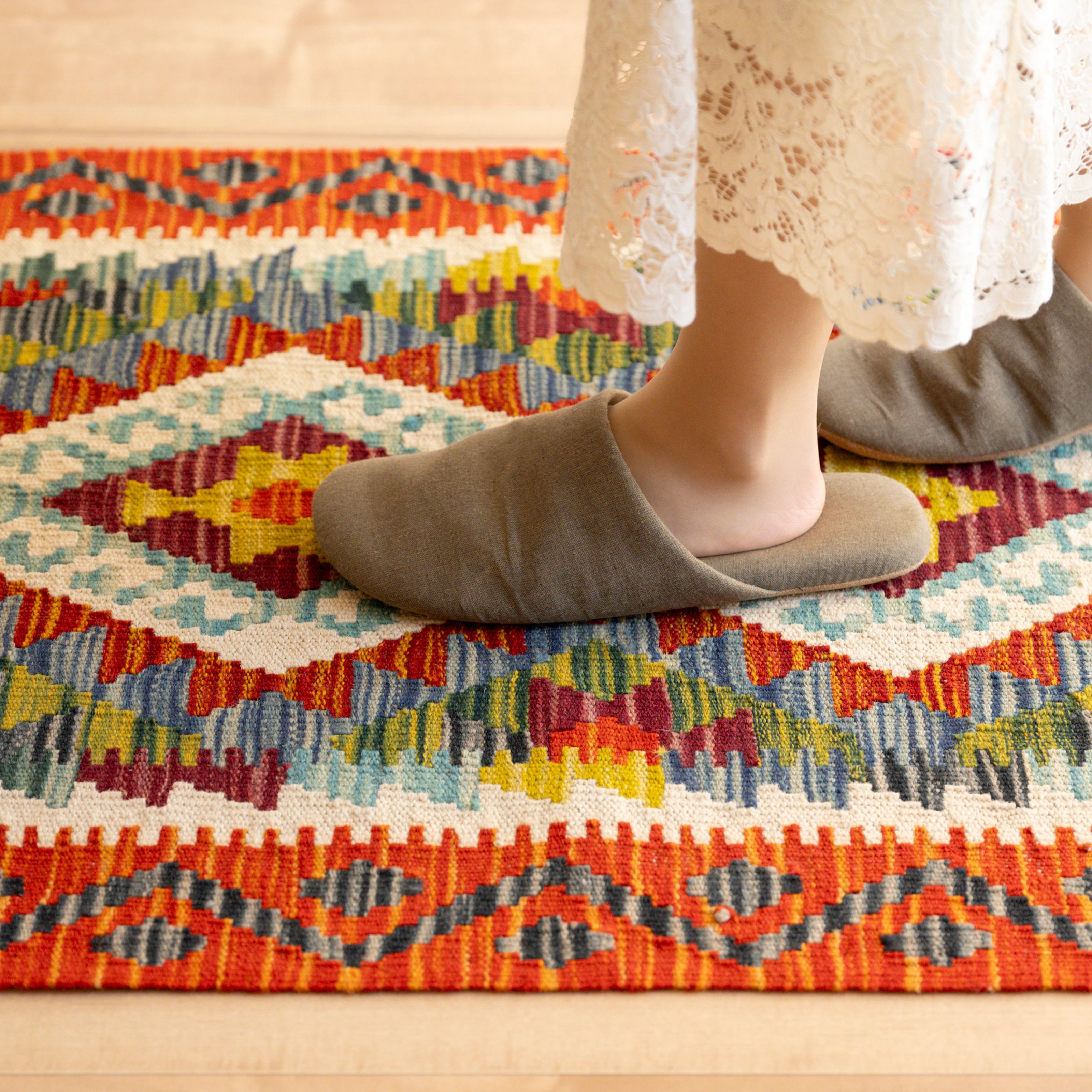 初めて素足でキリムに足をのせると、ちょっとゴワゴワした印象があるかもしれません。