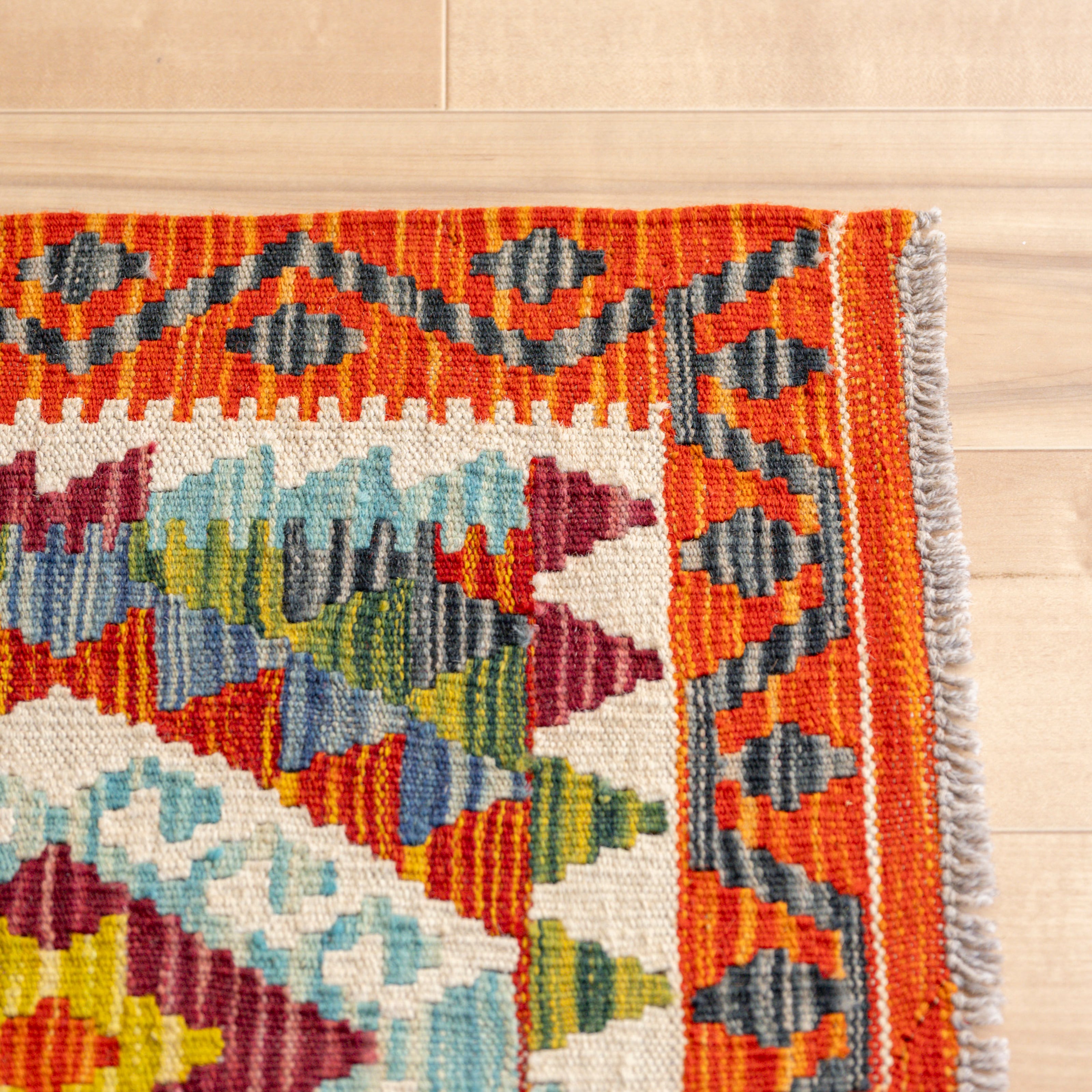 アフガニスタンで手織りでつくられた、カラフルなキリムラグ。