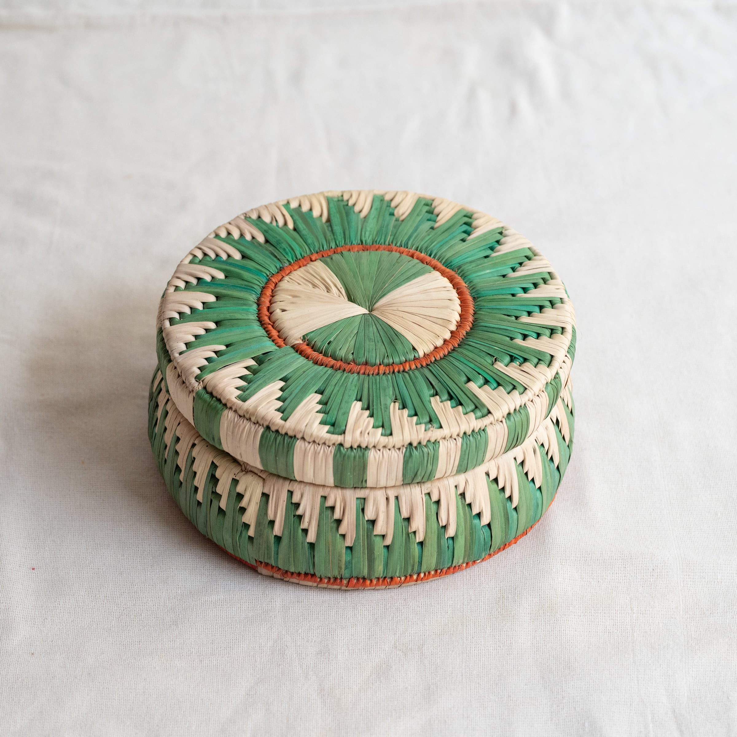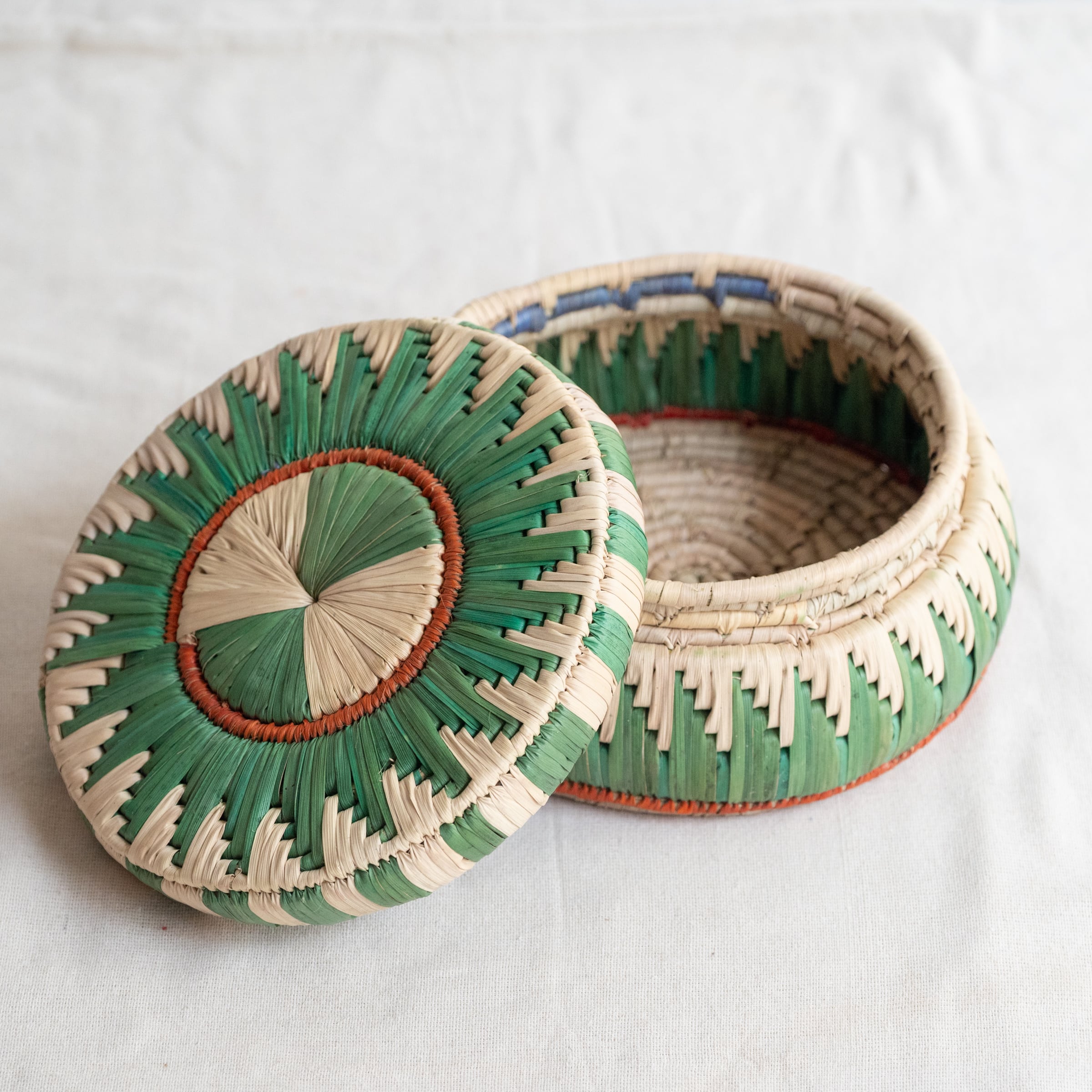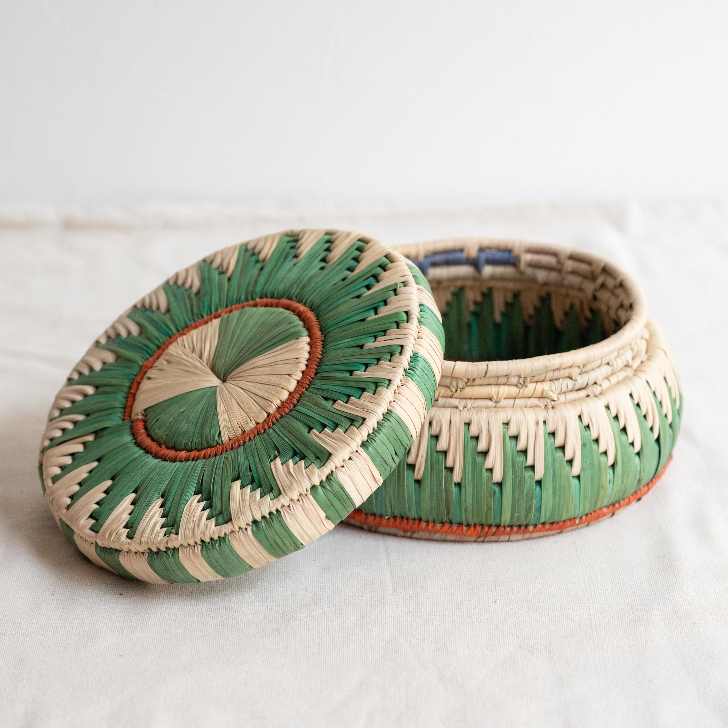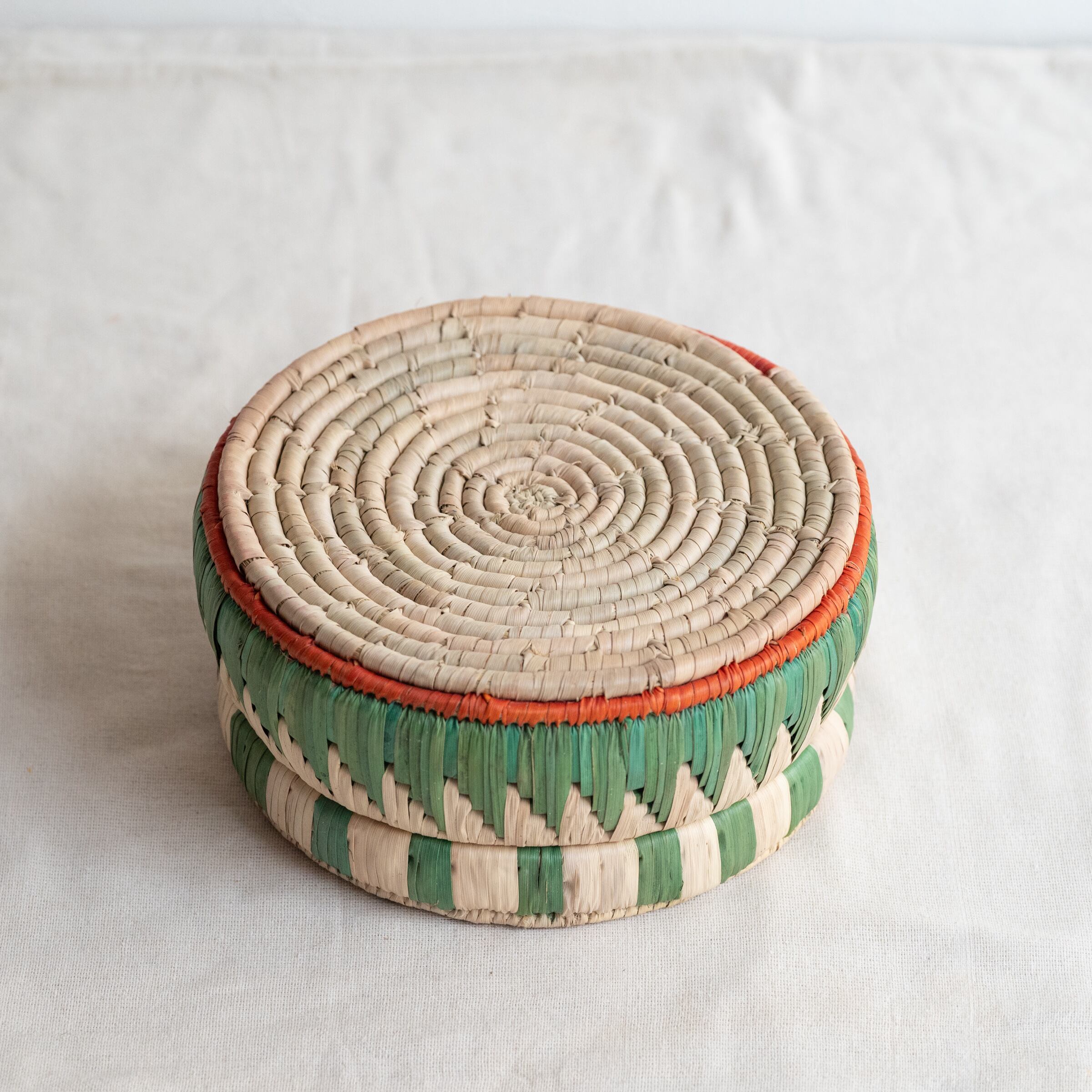 カラフルなパキスタンのかごシリーズの、フタ付きのデザインです。