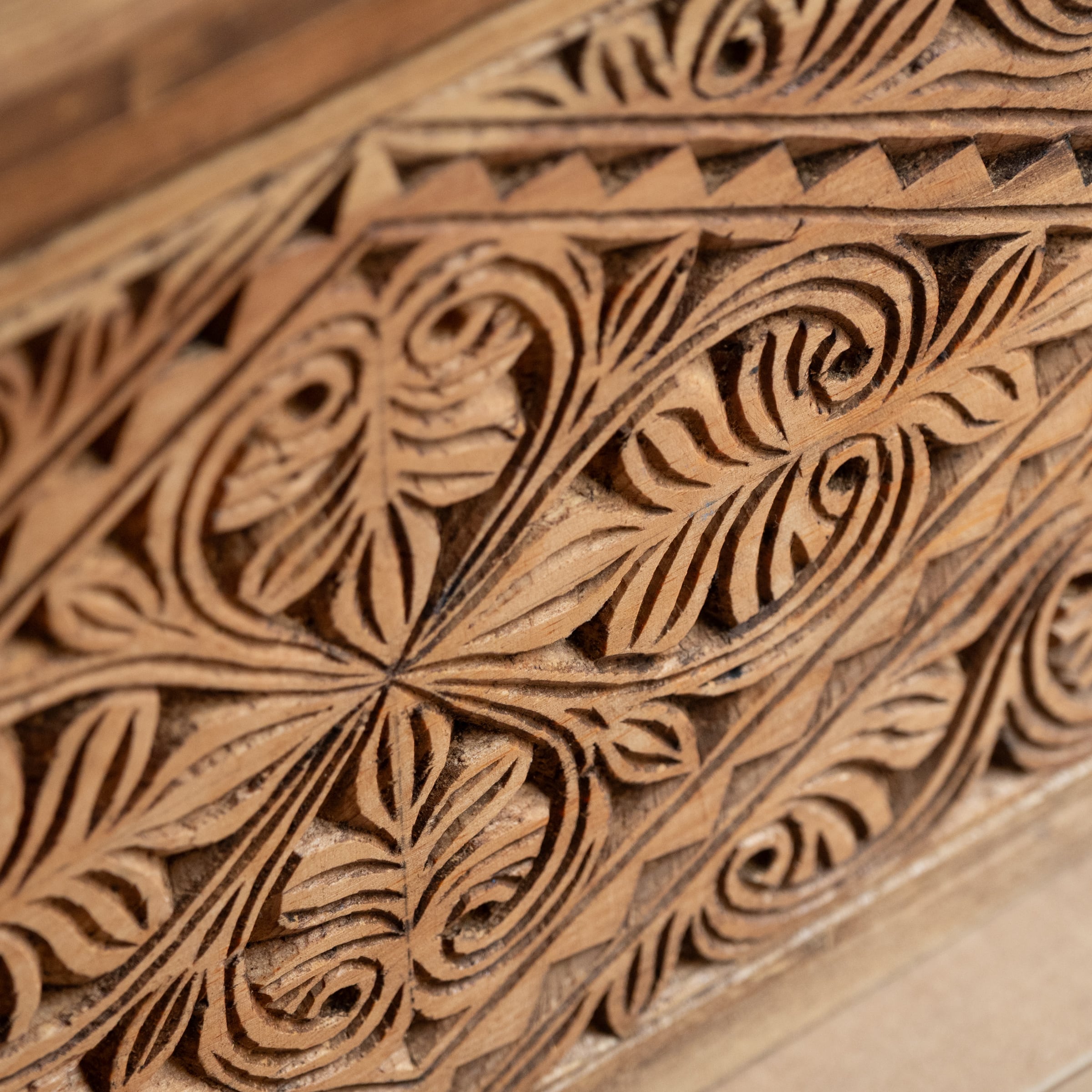 前面にパキスタンの職人がぎっしり手彫りの彫刻を施した木箱。